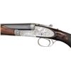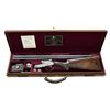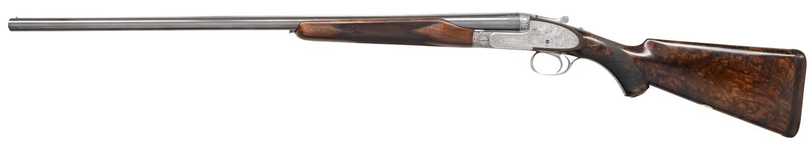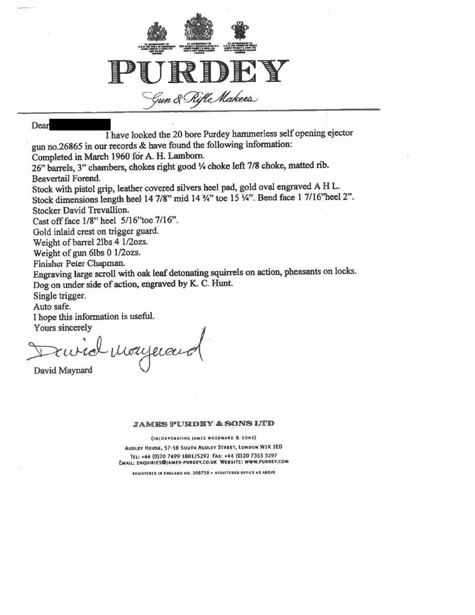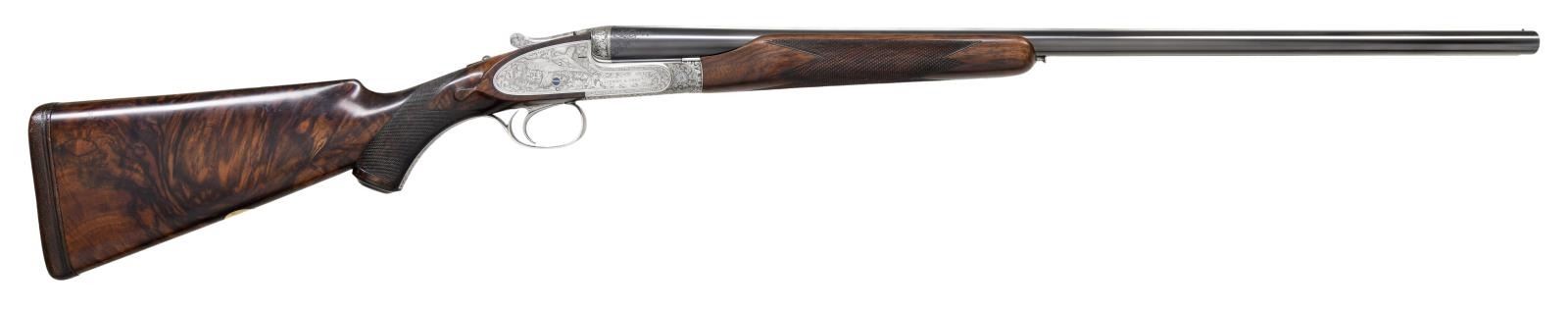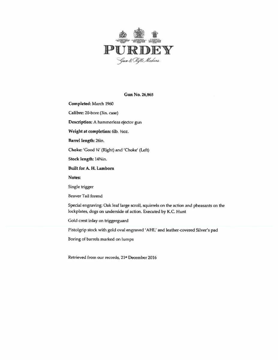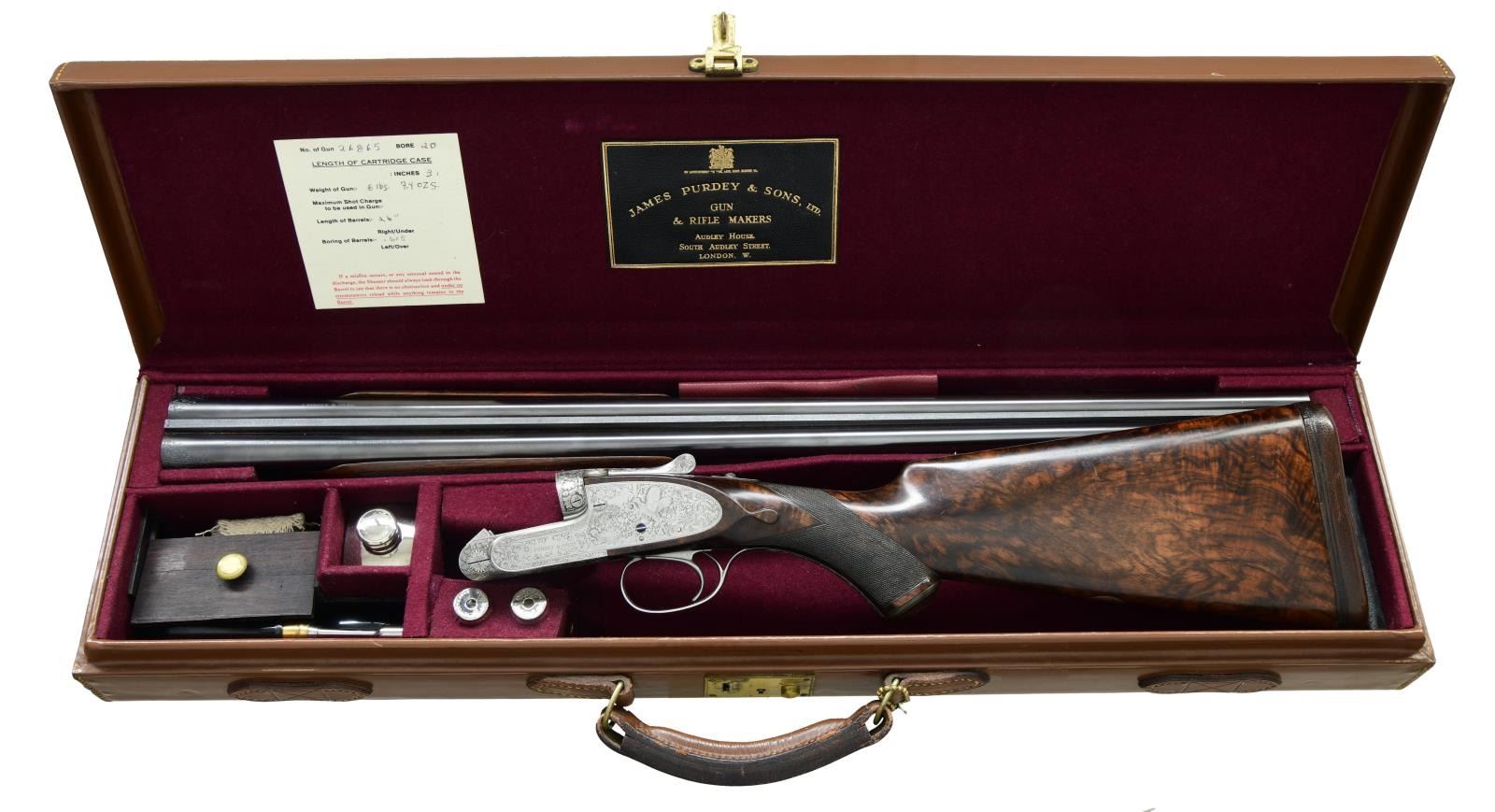 SHOTGUN. Cal. 20 ga. S# 26865. Bbls. 26" chopper lump. Sidelock action features selective ejectors, bushed firing pins, cocking indicators & single non-selective trigger. Exquisite full coverage engraving is the work of K. C. Hunt. Lockplates have game scenes w/ pheasants. Floorplate features a hunting dog portrait. Scenes are surrounded by vine type foliate scroll. Bolsters have relief oak leaf engraving w/ squirrels. Long tang trigger guard has gold inlaid crest. Beavertail forearm & pistol grip stock of exhibition grade walnut having vivid burl figure. Features include point pattern wraparound hand checkering, teardrop points & hard rubber grip cap. Toeline of stock has oval nameplate w/ initials "JAM". LOP: 14" over a leather covered pad. DAC: 1 9/16". DAH: 2 1/8". Stock has a neutral cast. Bore diameter: R .616 L .616. Choke constriction: R cyl. bore L .012. Minimum wall thickness: R .031 L .030. WEIGHT: 6 lbs, 0.6 oz. UNATTACHED ACCESSORIES: leather covered case w/ burgundy fitted interior. Inside lid has James Purdey & Sons label & specifications label. Case contains instruction booklet, game register booklet & factory letter. Letter shows completion date of March 1964 for A.H. Lamborn & details original specifications. Accessories consist of oil bottle, snap caps, turn screw, firing pin wrench, 2 piece ebony cleaning rod & cleaning accessories. Also included is a Purdey & Sons Syvelt Cloth. Case has a canvas cover w/ initials "J.A.M.". CONDITION: bbls. retain 97% blacked finish. Action has a pleasing gray appearance. Wood finish shows light wear w/ scattered marks. Chambers are original 3”. Action is tight & on face w/ top lever sitting just right of center. Very good bright bores. (24-2180/DS). CURIO. $17,500-27,500.