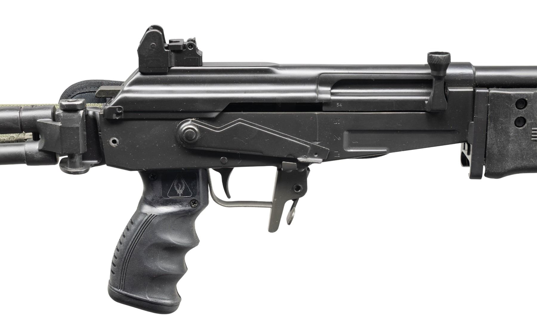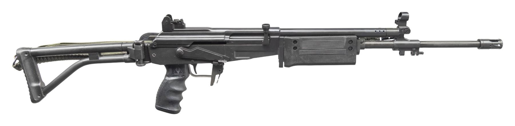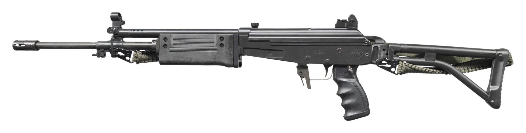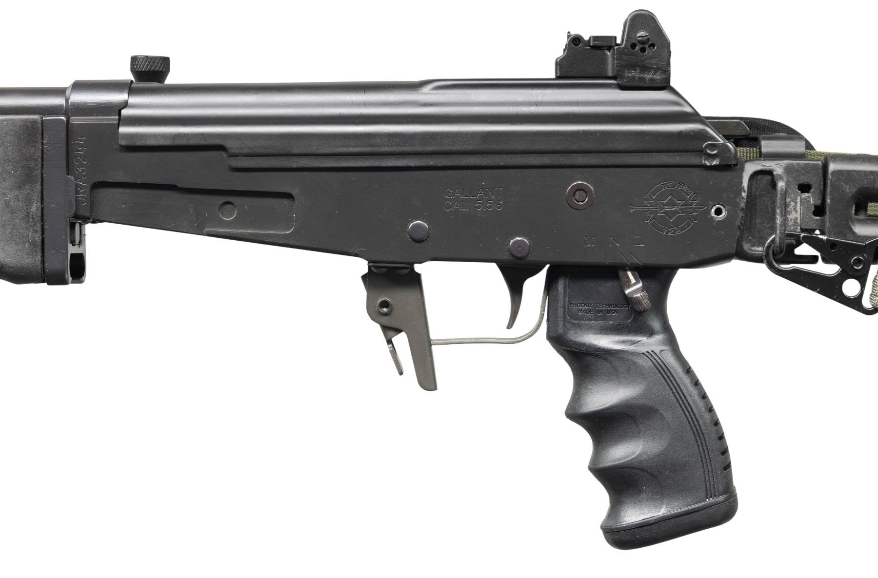 Cal. 5.56mm. S# JRA3244. Bbl. 18". Gallant (Galil) semi-automatic rifle mfg. by James River Armory from surplus parts on a new milled steel receiver. The left side of the receiver is marked with the S#, followed by "GALLANT/ CAL 5.56", Hebrew selector markings, and an apparent stylized IDF (Israeli Defense Force) insignia, with additional Hebrew selector markings present on the right. Underside of receiver is marked with James River Armory's mfg. information. Underside of bbl. is marked "5.56 NATO 1/7". Metal components exhibit an apparent enamel type finish applied over a phosphate finish overall. Piston exhibits a chrome plated finish. 2-piece grooved black synthetic handguards, with Phoenix Technology finger grooved black synthetic pistol grip, and steel side-folding buttstock. Standard Galil pattern post front sight and dual aperture rear sight graduated "3" and "5". Rear sight base retains its flip-up night sight. Front flip-up night sight is absent. Receiver features a milled panel on the left for a scope mount attachment, as well as 2 selector levers. Birdcage flash hider. Rifle is fitted with an OD paracord and nylon sling. Mag. is absent. CONDITION: metal components retain virtually all of their original factory finish, exhibiting a few small spots of light edge wear, as well as some scattered spots of light pitting beneath the finish. Bore is bright, exhibiting consistent light pitting, while retaining strong rifling throughout. Proper manual mechanics, with 3rd position on selector levers also being semi-automatic. Polymer furniture shows some superficial marks from handling and storage, but otherwise remains sound. (25-4632/MLW). MODERN. $800-1,200.