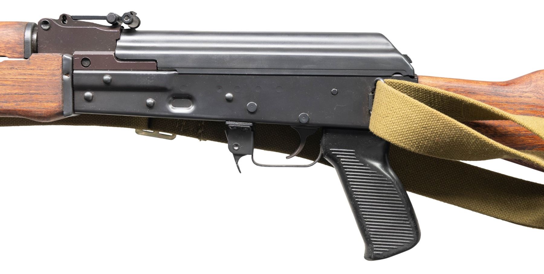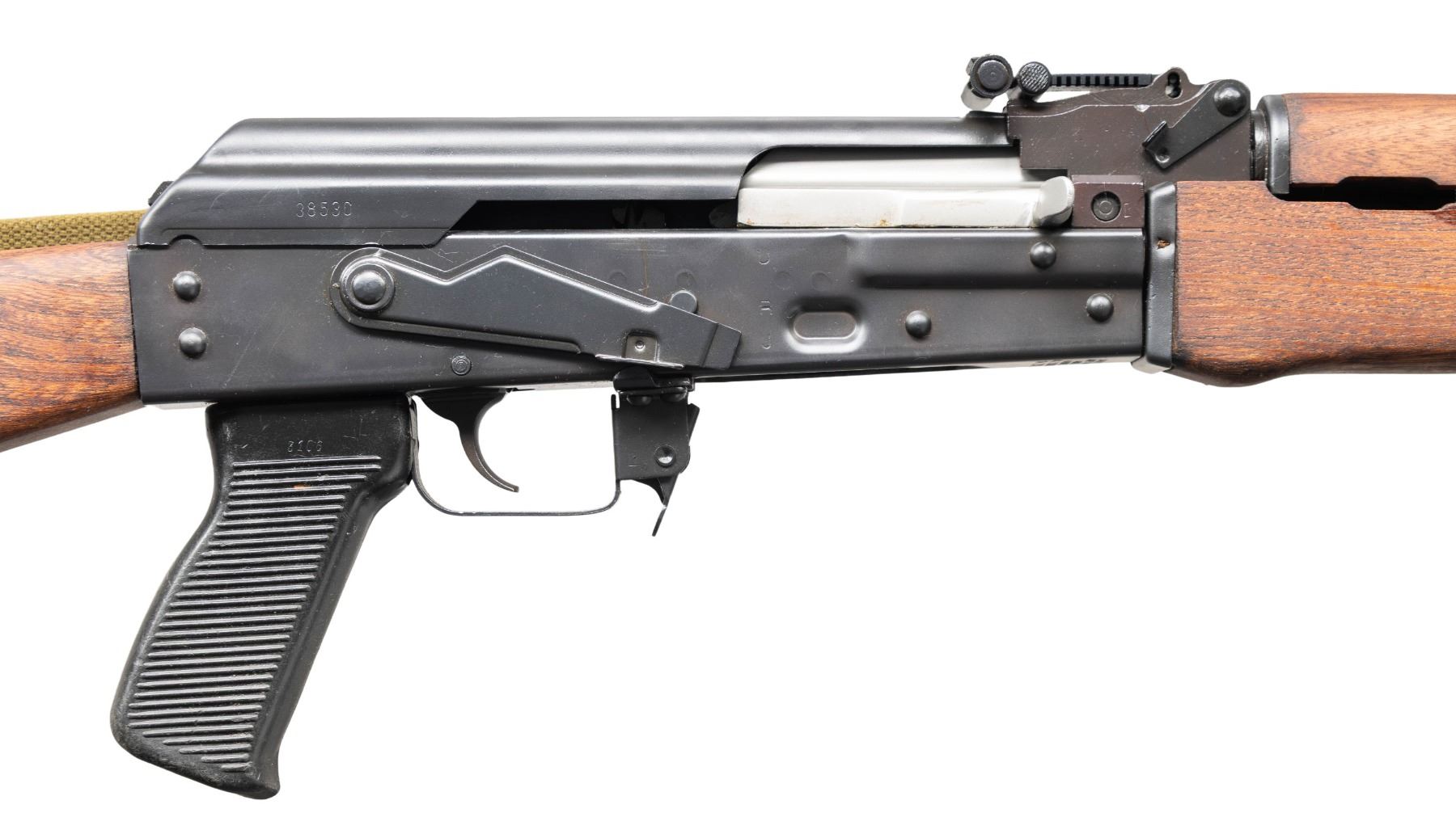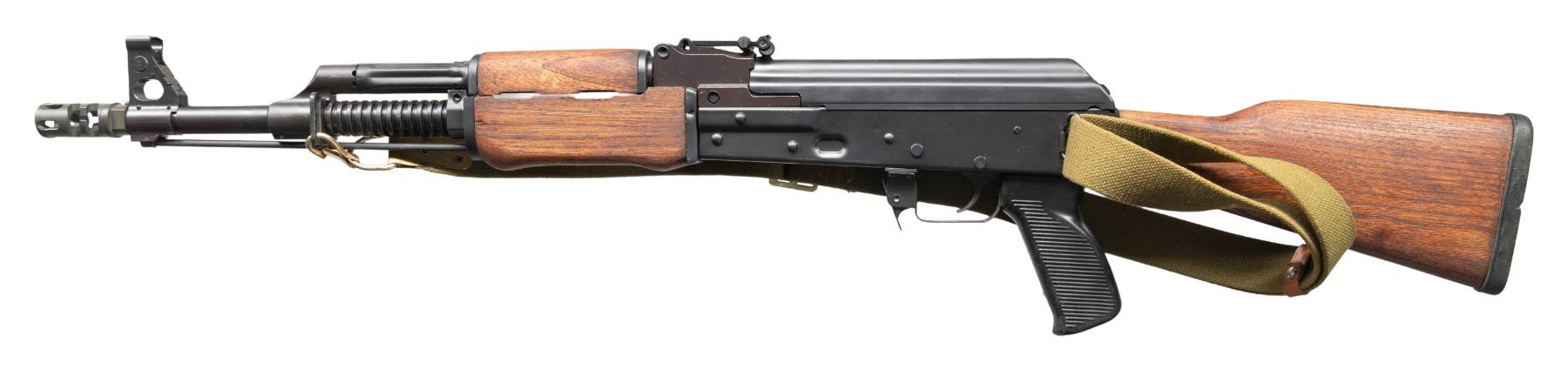 Cal. 7.62x39. S# 720378. Bbl. 16" heavy RPK style with muzzle brake. Post front sight with protective ears & flip up night sight. RPK style rear sight graduated to 1000m. Shortened James River RPK style rifle built using a combination of Yugo & US made parts. No bipod present. Matte black finish. Yugo hardwood stock & handguard. Grooved black pistol grip. Left side sling provisions with green canvas sling. Cleaning rod present. MAGS: none present. CONDITION: furniture shows scattered handling marks & some dings. Metal retains 98% matte black finish with some light edge wear & handling marks. Bolt will occasionally get stuck at rear but action is otherwise functioning properly when hand cycled. Bright near excellent bore. (25-4640/MJC). MODERN. $700-1,000.