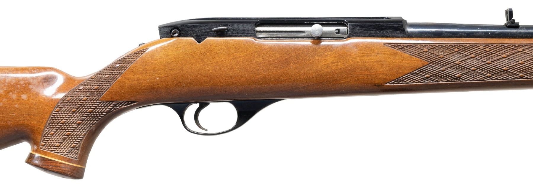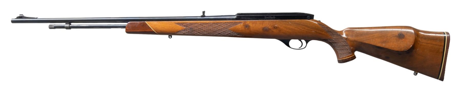 RIFLE. Cal. 22 LR. S# JT53050. Bbl. 24". Sporting sights. Tubular mag. Lever on right side of grooved receiver allows the rifle to be semi-auto or single shot. Skip-line checkered Monte Carlo walnut stock w/ rosewood forearm tip, grip cap & brown pad. CONDITION: very good blue with pinprick patina. Very good wood finish with mildew stains, handling marks & oxidation on sling studs. Very good bore. (25-3085/MD). MODERN. $300-500.