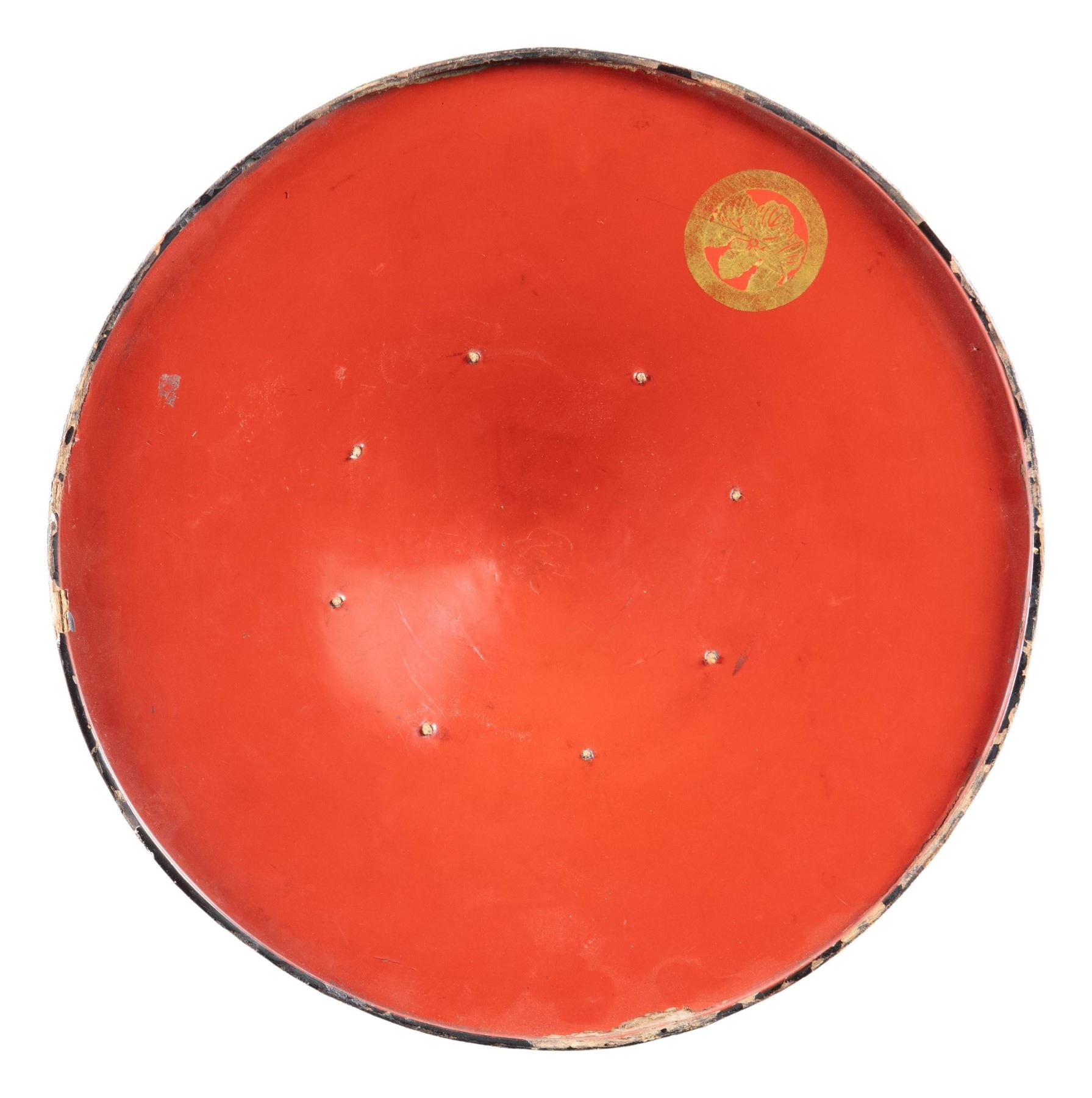 SAMURAI JINGASA. This fine jingasa measures approximately 14 1/2" in diameter with a domed center. The exterior decoration includes copper colored flowers and vegetation with two stunning black and red colored butterflies with copper colored highlights. The interior is red enamel with a gold 2" mon on one side. There are eight attachment points around the center likely for a liner. CONDITION: The jingasa is generally in fine condition but has had some paint restoration at the top of the crown and on the edges. There is notable chipping at the base of the rim. The exquisite designs and the mon are not effected by this skilled in painting. (02-25820/BF). $1000-2000.