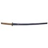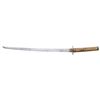 Overall length: 36 1/4". Blade length: 25 1/2". Blade has no perceptible hamon due to improper cleaning. Copper habaki. Interesting iron tsuba depicting 2 well articulated lobsters or prawns. There is 1 seppa below the tsuba. Nakago has a single mekugi-ano. There is a signature on 1 side of the nakago that appears to be 5 characters but is difficult to discern due to oxidation & pitting. Matching fuchi & kashira. Brown tsuka ito w/ white same & 2 interesting menuki featuring what appears to be a person beating a drum. It is difficult to see the menuki due to the tsuka ito. Black painted wooden saya w/ a single brass suspension loop & iron ring. CONDITION: blade has a medium gray, cleaned, mottled finish w/ a sm. forging flaw 11 1/2" up from the tsuba. Tsuba has an ancient dark patina. Tsuka shows moderate to heavy wear. Saya has light overall wear. PROVENANCE: Estate Collection of Jack Verret Sr. (02-16478/BF). $300-500.