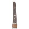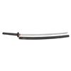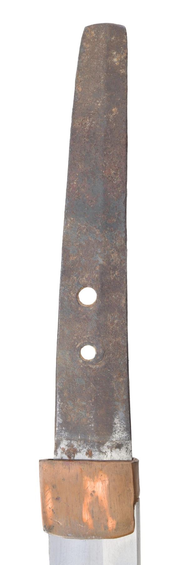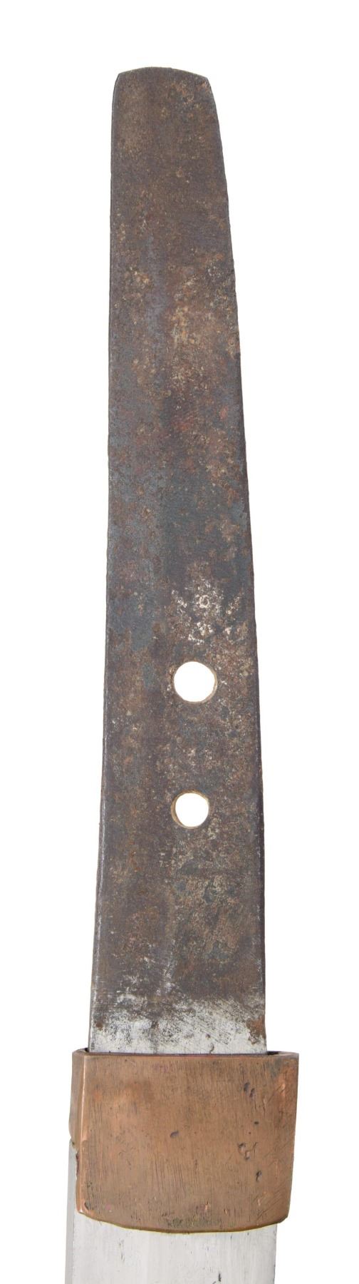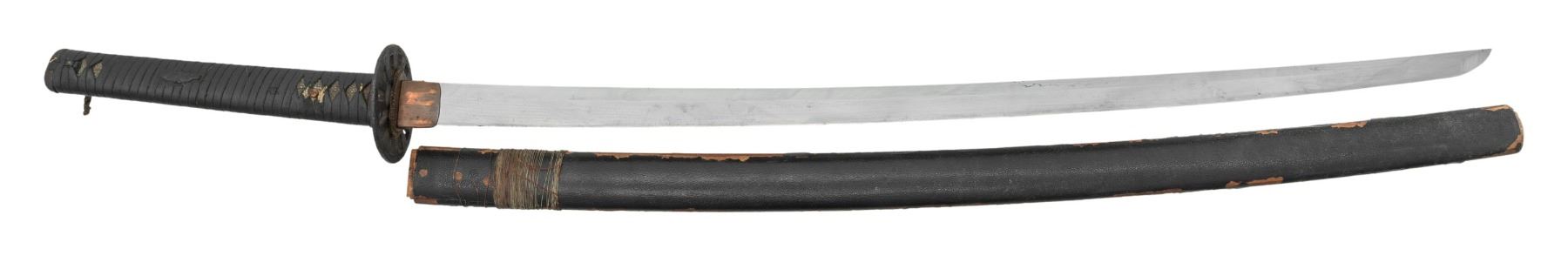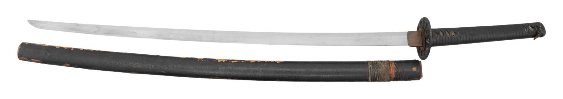 Overall length: 38 3/4". Blade length: 28 3/4". Blade has a straight hamon and a copper habaki. The nakago has two mekugi-ana and is not signed. There is one copper seppa and one leather seppa below the round, lineal-decorated, slotted iron tsuba, as well as one leather seppa above. The tsuka has a matching fuchi and kashira, and white same can be seen below the black leather tsuka-ito. No menuki are present. The saya is black-finished wood with an iron hanger. CONDITION: the blade has a good polish and shows a single forging flaw near the spine. The tsuba has a pleasing black finish with no heavy oxidation. The tsuka does show light wear. The saya has heavy wear with finish loss and is missing the koiguchi. (02-23598/BF). NON-GUN. $500-750.