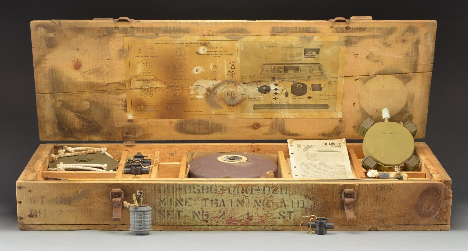 A fascinating inside look at the perils our GIs faced during WWII. This set is unique & intriguing at first glance at the wood transit chest that houses it. Designed for our engineering units to prepare them for identifying & working w/ likely encountered Japanese ordnance in the Pacific theater of operations. In its entirety, weighing approx. 40 lbs., it contains multiple examples of Japanese mines, fuses & grenades w/ enough moving parts to safely & accurately learn recognition, disarming & disposal of these likely adversaries. It appears that only 592 sets were available for distribution, this one complete w/ the original technical bulletin “TB ENG 79”. The lid of the transit chest, measuring 39"x13"x5.5", is stenciled on the outside “MINE TRAINING AID” / “SET NO.2, JAPANESE.” / “SNL SET NO. 386-02”. On the lid interior two printed keys, the first a translation of Japanese inscriptions & the 2nd an 8"x7.5" photograph of the kit contents. Included in the kit, each in their designated spots, are the following: Type 93 anti tank mine, Type 93 fuse, bar (yardstick mine) w/ 4 fuses, Type 97 hand grenade, Type 3 landmine w/ fuse, Type 99 magnetic mine & 2 original copies of the 24 page TB ENG 79 War Department Technical Bulletin dated June of 1945. All items in this kit were U.S. mfg. to accurately resemble their original counterparts right down to the nomenclature. CONDITION: all items contained appear to remain free moving & functional after all these years. The crate itself is still sturdy w/ original functioning metal clamps & hinges. Even the stenciling on exterior surfaces still remains legible. (02-16281/JZ). $1,200-1,800.