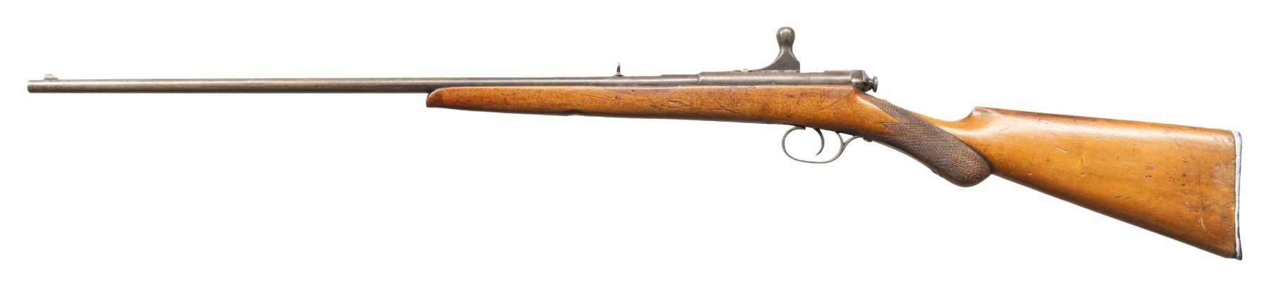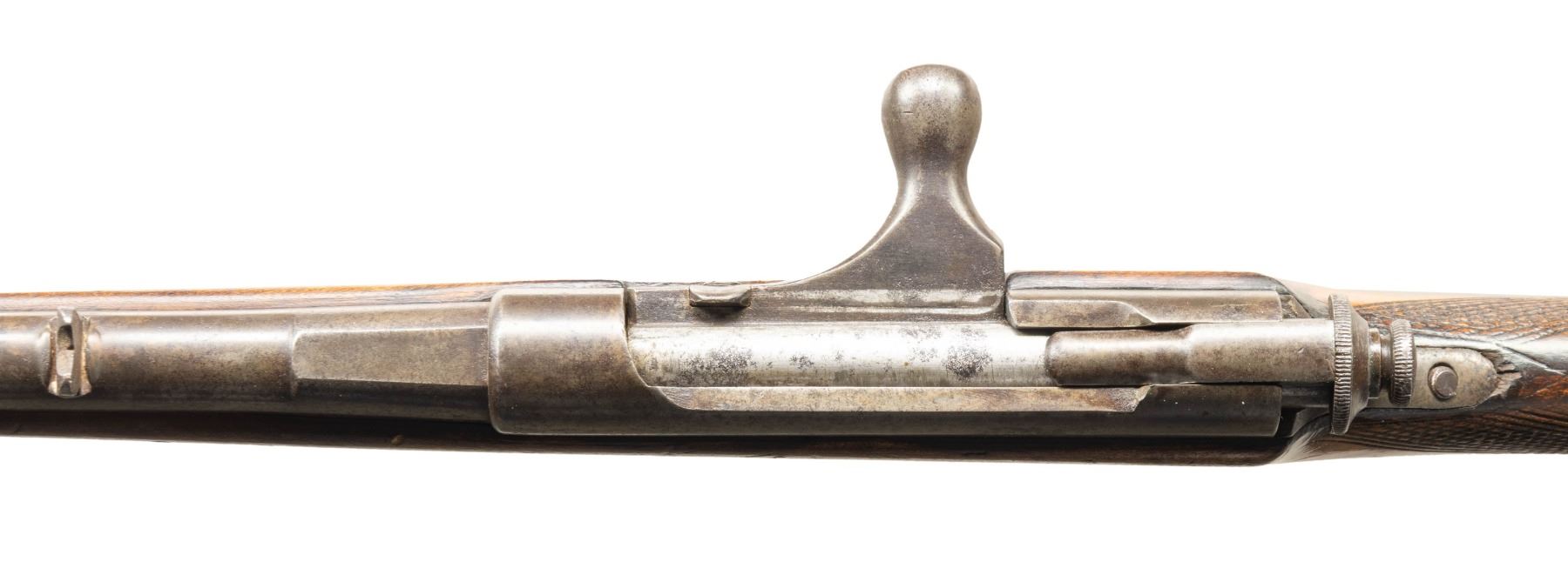 Cal. 7.8mm. S# 5. Bbl. 27.5". Blade front & semi-buckhorn rear sight. Single shot, scaled down military Murata action with matching numbered box. Hardwood checkered stock w/ hard rubber buttplate. UNATTACHED ACCESSORIES: various online research paperwork. CONDITION: metal has traces of blue with balance being gray/brown patina with marks & peppery oxidation. Wood shows numerous dings & scratches with occasional sm. crack or hole. Bore shows pitting. PROVENANCE: From the PMRB Collection. (25-5881/MD). CURIO. $400-600.