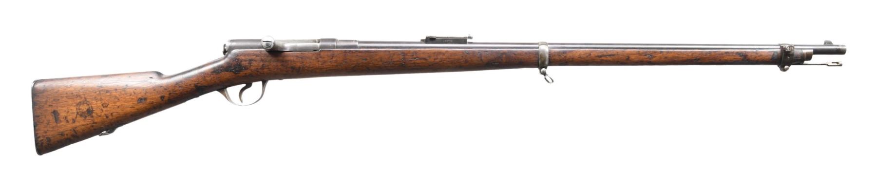Cal. 11mm Murata. S# 103551. Bbl. 32". Blade front sight. Ladder rear sight graduated to 1500m. Matching numbers on receiver, bbl., rear sight, rear band, and rear sling plate. Other visible parts are mismatched or unnumbered. Top of bbl. shank has intact mum and a circled marking with Asian characters. Bbl. serial also has "00" prefix, denoting withdrawal from military service. Asian hardwood stock with bottom-mounted sling swivels. Right side of butt has faded roundel. Cleaning rod is present. CONDITION: refinished stock set has an added finish with a couple chips, scattered black staining, dings, and handling wear. Metal retains about 30% arsenal blue, with overall fading to gray, some light dings on trigger guard, and scattered light oxidation. Action appears to function properly when hand-cycled. Very good, bright bore with some light pitting. (01-25852/MJC). ANTIQUE. $800-1,200.