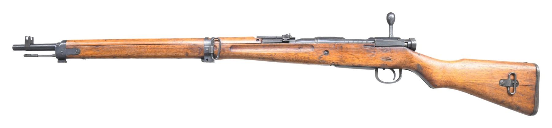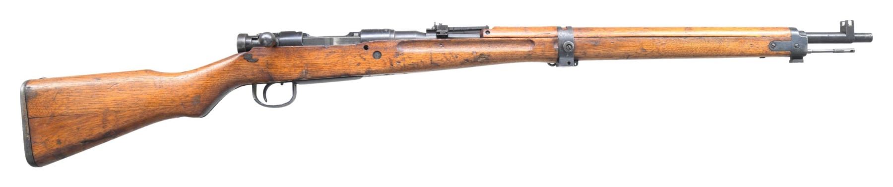 Cal. 7.7 Jap. S# 61309. Bbl. 25 1/2". Blade front sight with protective ears. Ladder aperture rear sight graduated to 1500m with AA wings. AA wings are a bit bent. Bayonet lug is matching to receiver but bolt parts are mismatched. Receiver top has ground mum & Type 99 markings. Left side of receiver has serial number, Nagoya & 2nd series markings. Blued finish. Asian hardwood stock set with two piece butt & left side sling swivels. Bottom of butt has strong Nagoya Kanji proofs. Cleaning rod present. CONDITION: stock set shows a few gouges, scattered dings, staining & handling marks. Metal retains 60% original blue with wear around mum grind mark, scattered oxidation, edge wear, fading, operational wear, & some light pitting on bottom metal. Action functions properly when hand cycled. Very good bore with strong rifling. (25-3806/MJC). CURIO. $300-400.