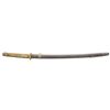 Overall length: 36 1/2". Blade length: 36 1/4". Blade has no perceptible hamon but does have a fuller running the length of the top of the blade. Gilded copper habaki. Classic gilded brass tsuba w/ 4 cherry blossoms on each side. There is 1 seppa above & below the tsuba. Nakago has 3 mekugi-ano. There is an 8 character signature on 1 side of the nakago & a 4 character signature on the other. Matching fuchi & kabuto-gane. Brown tsuka ito w/ white same & 1 brass 3 cherry blossom menuki. Interesting leather covered wooden saya w/ raised lineal design. There is a matching suspension ring & lg. 7" brass drag at the base of the saya. CONDITION: blade has a medium gray finish w/ scattered areas of discoloration & minor pitting near the tip. The edge shows roughness but no notable chips or areas of delamination. Areas of gilt finish remain on the habaki & tsuba. Tsuka shows moderate wear. Saya shows moderate wear but remains solid. PROVENANCE: Estate Collection of Jack Verret Sr. (02-16479/BF). $400-600.