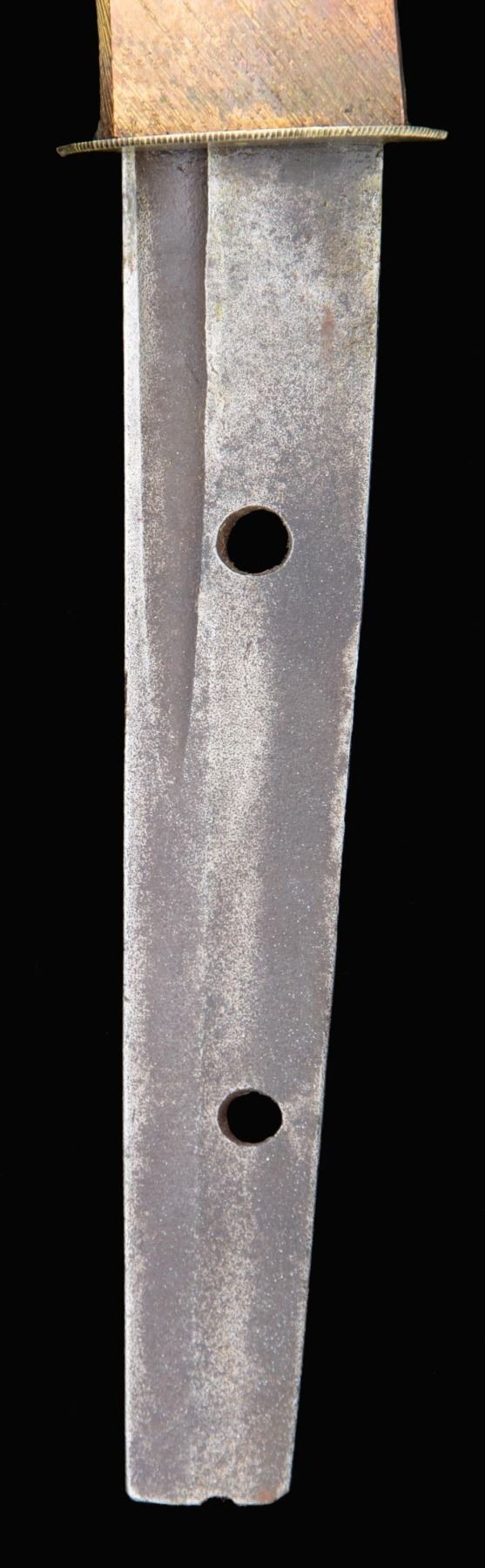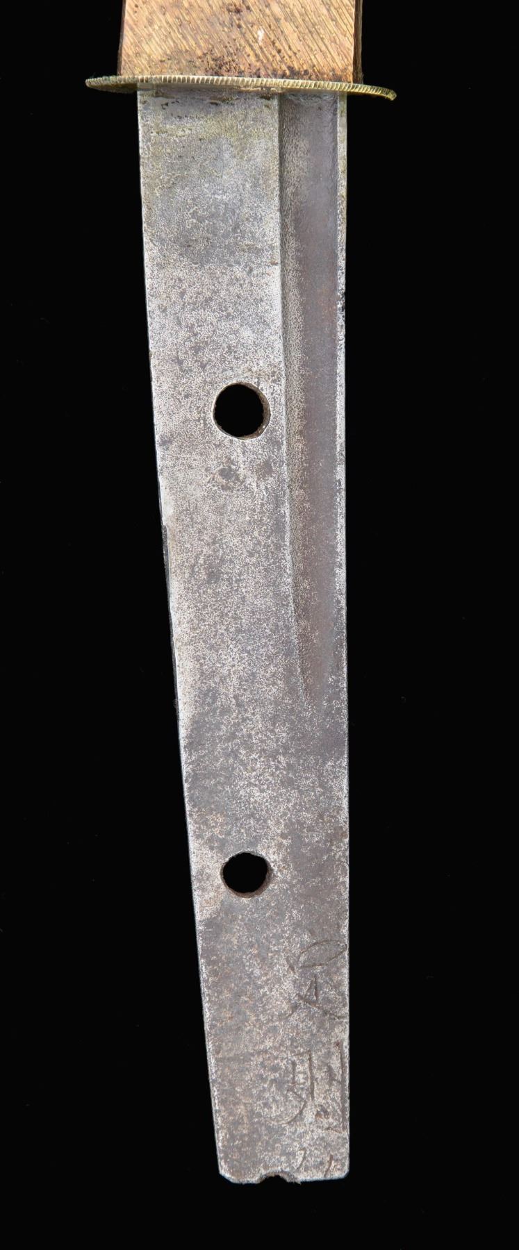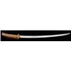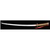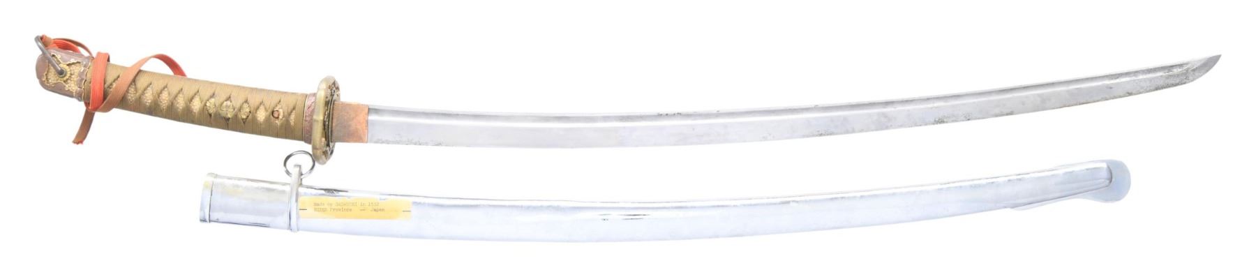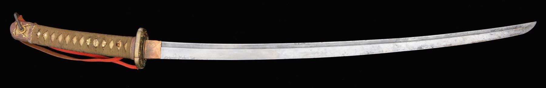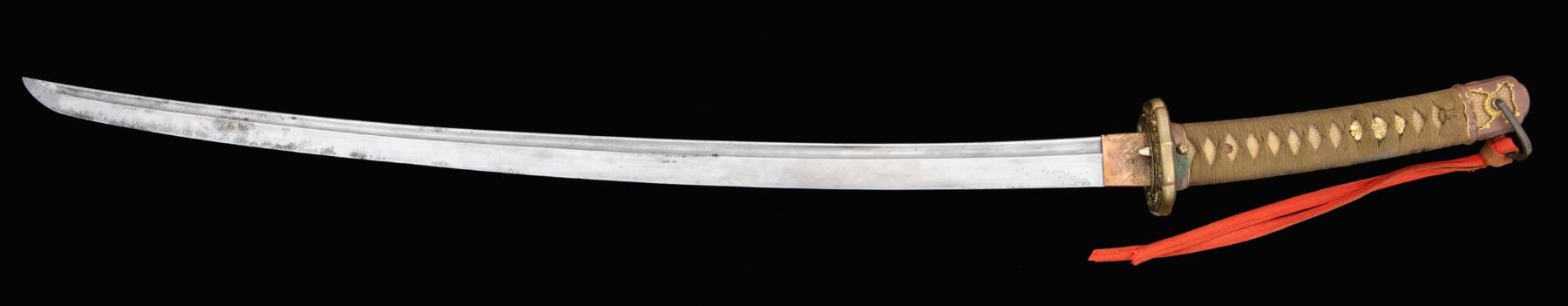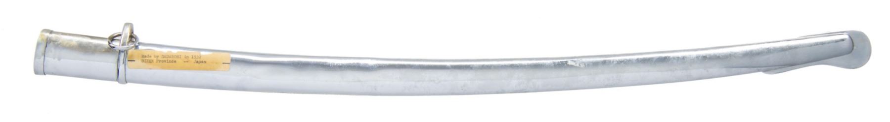 Overall length: 38". Blade length 27 1/4". An early katana possibly made by Sadanori of the Bizen province in 1532. Good light blade with an imperceptible hamon and a bohi that extends into the nakago. Copper habaki with diagonal striations. There are 2 seppa above and below the classic 4 cherry blossom brass tsuba. The nakago has 2 mekugi-ana with the remains of a 3rd at the tip of the nakago along with 2 characters, of a longer signature, remaining. Matching fuchi and kabuto-gane with copper 3 cherry blossom menuki. White same with light brown tsuka-ito. Nickle plated metal saya with a paper tag attached that reads " Made by SADANORI in 1532 BIZEN Province  --  Japan". partial tassel attached for a field grade officer. CONDITION: blade shows some staining and light pitting. Tsuba, tsuka and saya show light wear overall. (02-23835-2/BF). $600-1000.