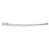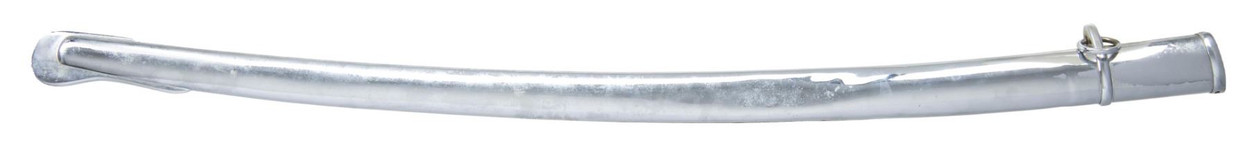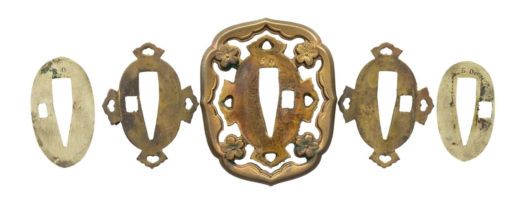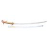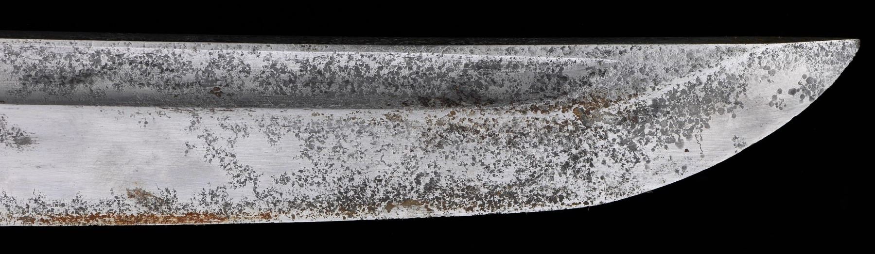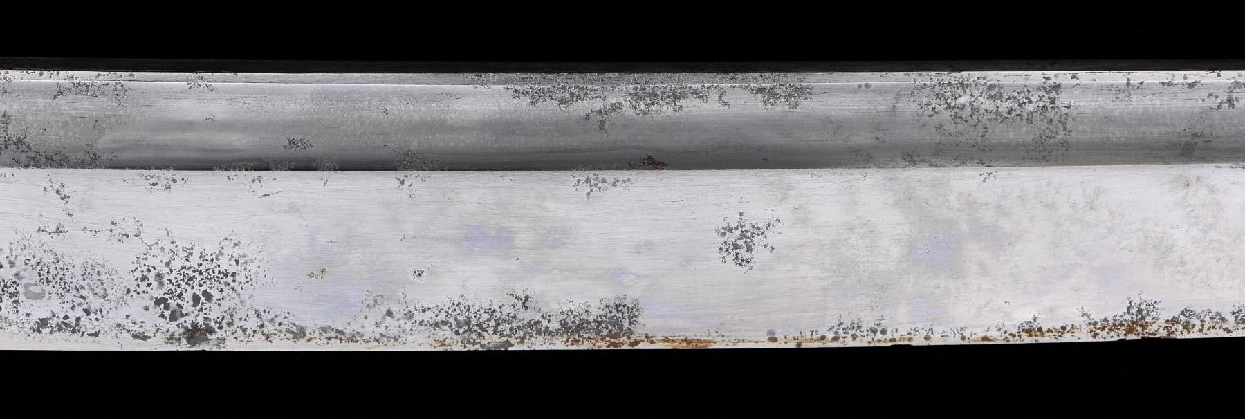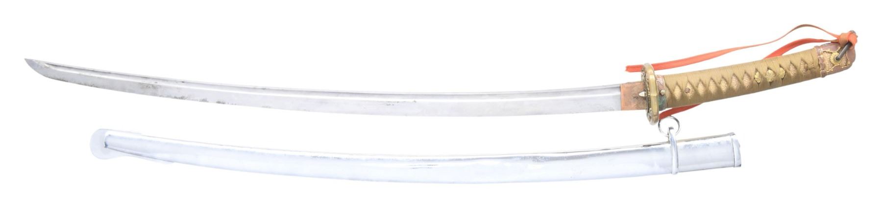 Overall length: 38". Blade length 27 1/4". An early katana possibly made by Sadanori of the Bizen province in 1532. Good light blade with an imperceptible hamon and a bohi that extends into the nakago. Copper habaki with diagonal striations. There are 2 seppa above and below the classic 4 cherry blossom brass tsuba. The nakago has 2 mekugi-ana with the remains of a 3rd at the tip of the nakago along with 2 characters, of a longer signature, remaining. Matching fuchi and kabuto-gane with copper 3 cherry blossom menuki. White same with light brown tsuka-ito. Nickle plated metal saya with a paper tag attached that reads " Made by SADANORI in 1532 BIZEN Province  --  Japan". partial tassel attached for a field grade officer. CONDITION: blade shows some staining and light pitting. Tsuba, tsuka and saya show light wear overall. (02-23835-2/BF). $600-1000.