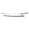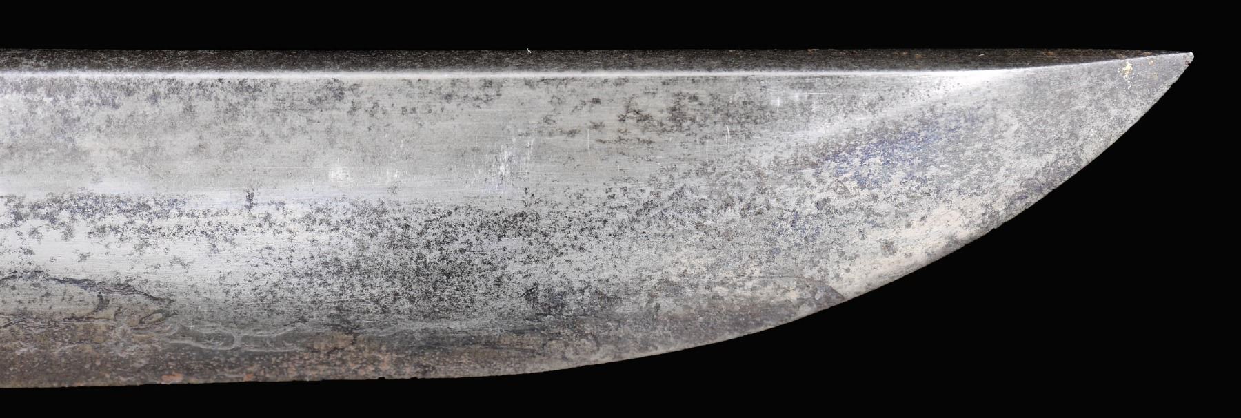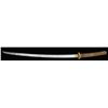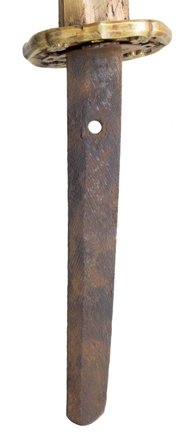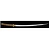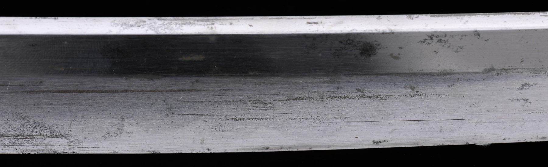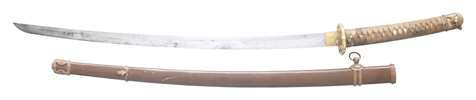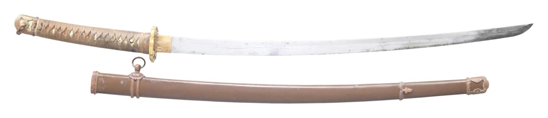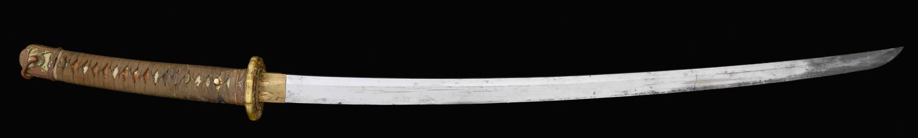 Overall length: 39 3/4". Blade length 27 1/2". Nice heavy blade with a barely perceptible wavy hamon and a gilded brass habaki. There are 2 seppa above and below the classic 4 cherry blossom brass tsuba. The nakago has a single mekugi-ana with a 13 character signature on one side. Matching fuchi and kabuto-gane with copper 3 cherry blossom menuki. White same with dull brown tsuka-ito. Dark brown painted saya with gunto mounts. CONDITION: blade shows staining particularly at the tip, but generally is quite good and would benefit from a professional polish. Tsuba and saya show light wear. Tsuka-ito is dirty and same is mostly deteriorated. (02-23834-2/BF). $400-700.