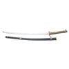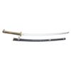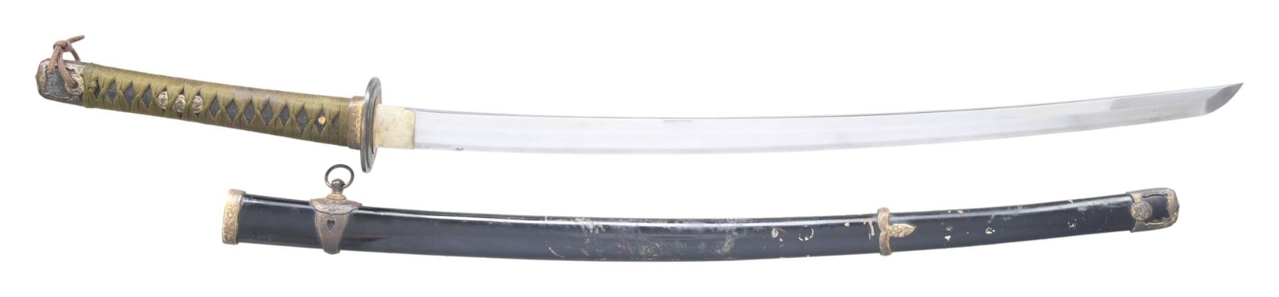 Overall length: 39 1/4". Blade length 26". Nice heavy blade with a straight hamon and a silvered brass habaki. There is a small seppa and a large rayed seppa above and below the plain iron tsuba. The nakago has a single mekugi-ana with 5 characters painted on it. Matching fuchi and kabuto-gane with plated iron 3 cherry blossom menuki. Black same with brown tsuka-ito. Black enameled wooden saya with gunto mounts. CONDITION: blade shows a beautiful polish but has a couple of very tiny nicks. Tsuba, tsuka and saya show light expected wear. (02-23834-3/BF). $500-750.