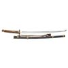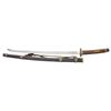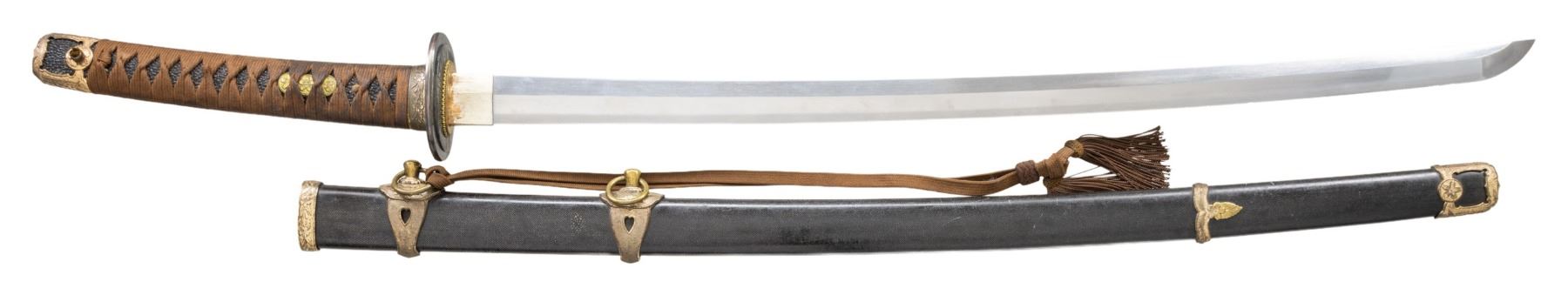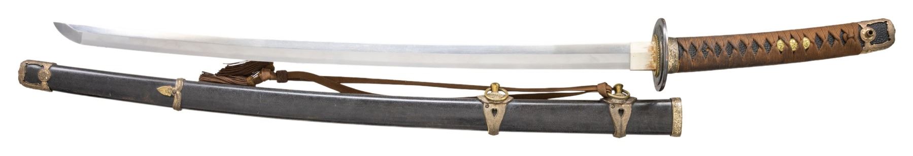 A nice shin-gunto katana measuring 39" overall with a 26" blade. Blade has a straight hamon and a silvered copper habaki. The nakago has a single mekugi-ana and no signature. The blackened copper/brass tsuba is relatively plain with 3 graduated seppa above and below. Matching fuchi and kabuto-gane. Brown tsuka-ito with black same and gilded 3 cherry blossom menuki. Smooth fish skin covered black saya with matching gunto. Late war brown tassel attached. CONDITION. blade has a very fine polish. Tsuka shows very light wear as does the saya. (02-24106/BF). NON-GUN. $600-900.