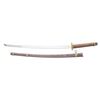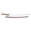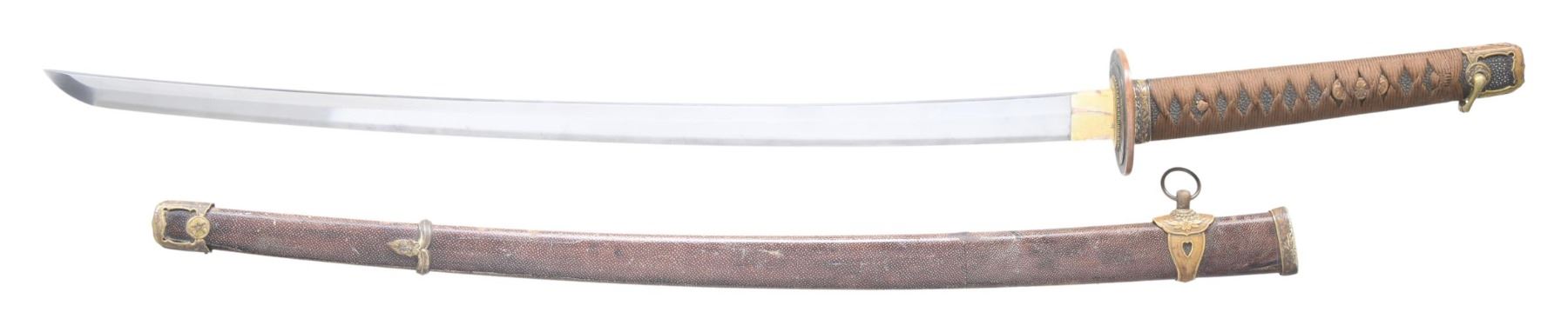 Overall length: 38 3/4". Blade length 26 1/2". Beautiful heavy blade with a straight hamon and a gilded copper habaki. There are 2 small and 1 large seppa above and below the signed copper edged iron tsuba. The nakago has a single mekugi-ana with a 7 character signature on one side and a 6 character signiture on the other. Matching fuchi and kabuto-gane with copper 3 cherry blossom menuki. Black same with brown tsuka-ito. Exquisite polished same-hada saya with gunto mounts. CONDITION: blade has a superb polish. Tsuba, tsuka and saya all show light wear. A beautiful shin-gunto katana. (02-23834-1/BF). NON-GUN. $500-800.