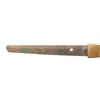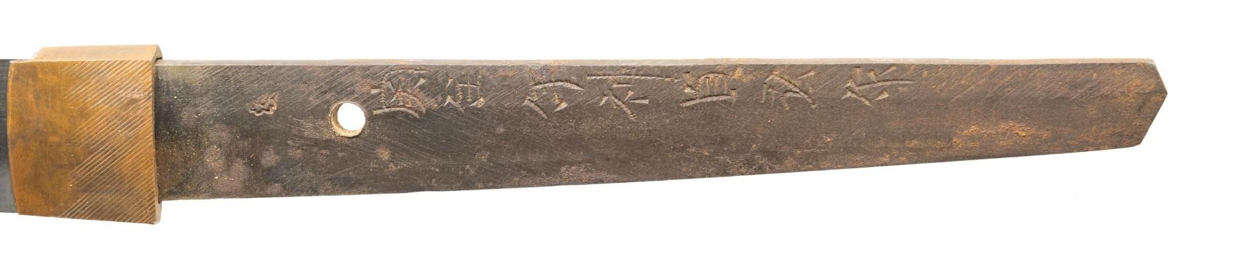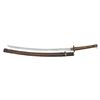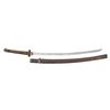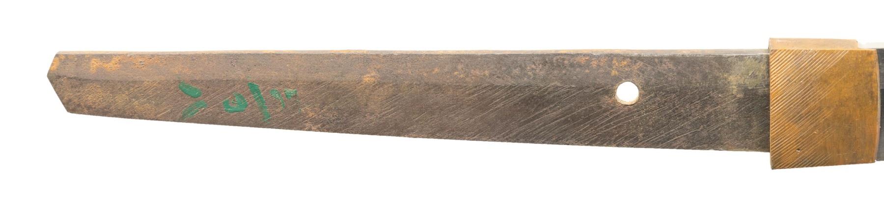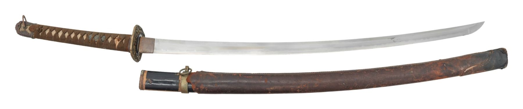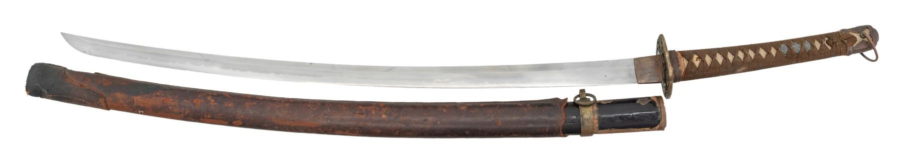 Overall length: 38 1/2". Blade length: 27". Blade has an irregular hamon and a copper habaki with incised diagonal lineal decoration. The nakago has a single mekugi-ana and has a 7-character signature on one side with two green-painted characters on the other side. There are two seppa above and below the gilded 4-cherry blossom tsuba. The fuchi and kabuto-gane match and appear original. The tsuka-ito is brown, and the same is white. There is a 3-cherry blossom menuki on each side of the blade. The saya has a black enamel finish on wood with a leather covering. CONDITION: blade has a decent polish, and the tsuka shows light wear with some verdigris on the menuki. The saya has losses to the top of the leather covering, but the body remains relatively solid. (02-23599/BF). NON-GUN. $400-700.