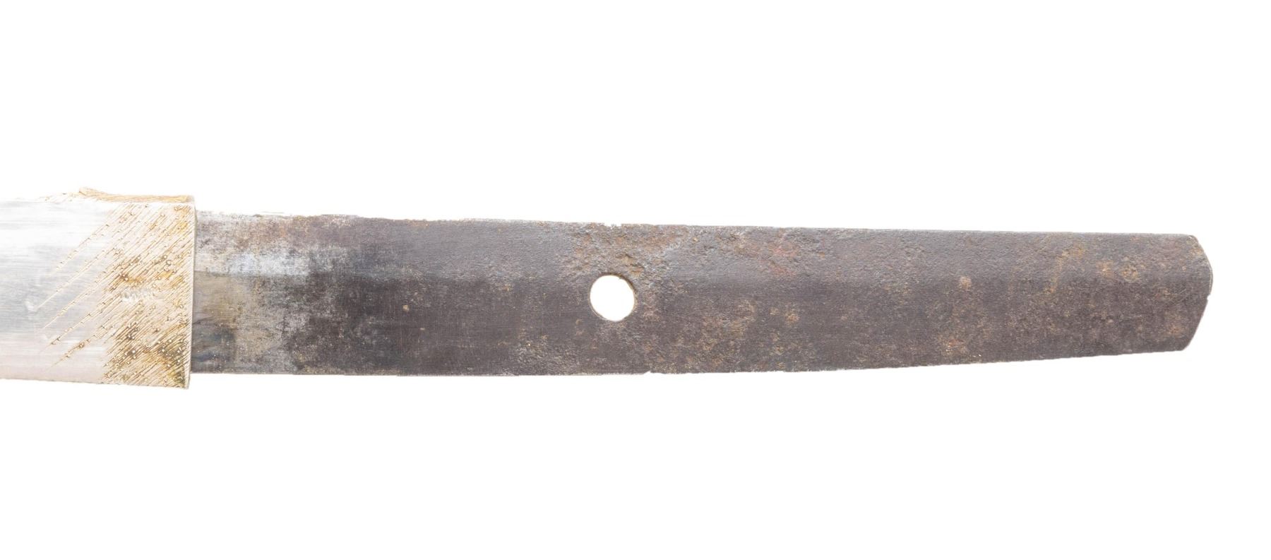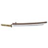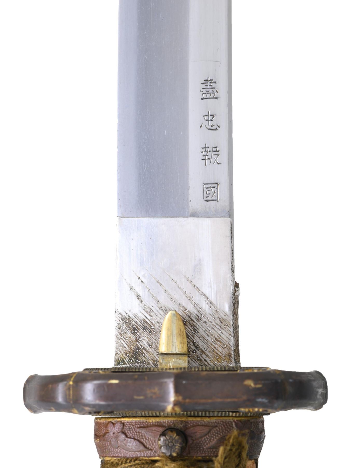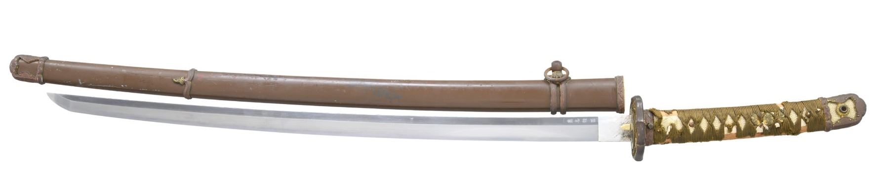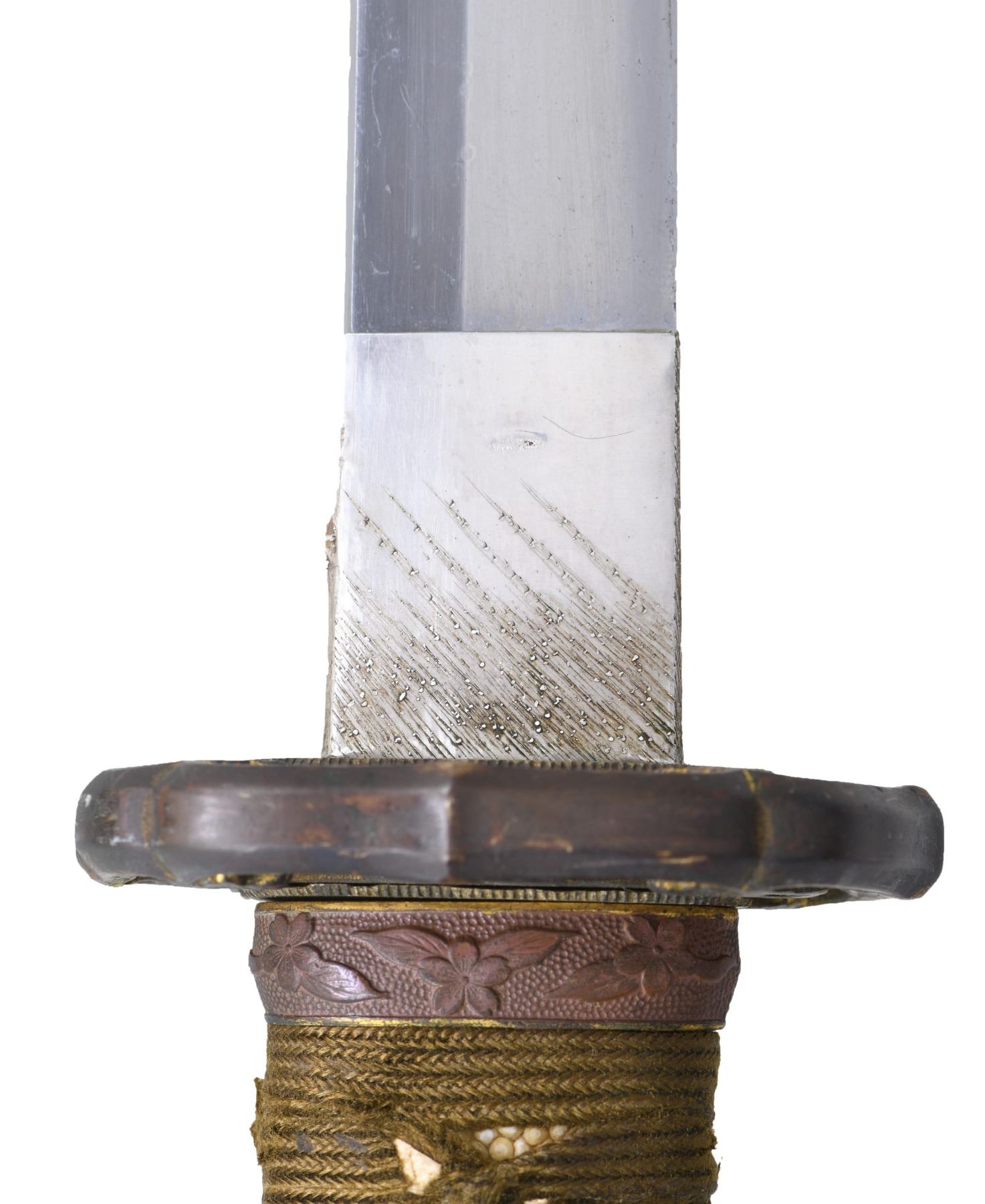 Overall length: 36 3/4". Blade length: 25 3/8". Blade has a straight hamon with a heavily silvered copper habaki with incised diagonal, lineal decoration. The blade has a 4-character signature near the mune just in front of the habaki. The nakago has a single mekugi-ana and is not signed. There are two seppa above and below the 4-cherry blossom gilded tsuba. The tsuka has a matching fuchi and kabuto-gane with white same. There is a brown tsuka-ito with gilded brass 3-cherry blossom menuki. Classic military saya with gunto mounts and a brown-painted finish. CONDITION: the blade has a fine polish with no notable flaws. The tsuka-ito is quite frayed, possibly from insect damage; otherwise, the tsuka is complete. The saya actually shows light wear overall. (02-23600/BF). NON-GUN. $600-900.