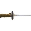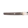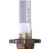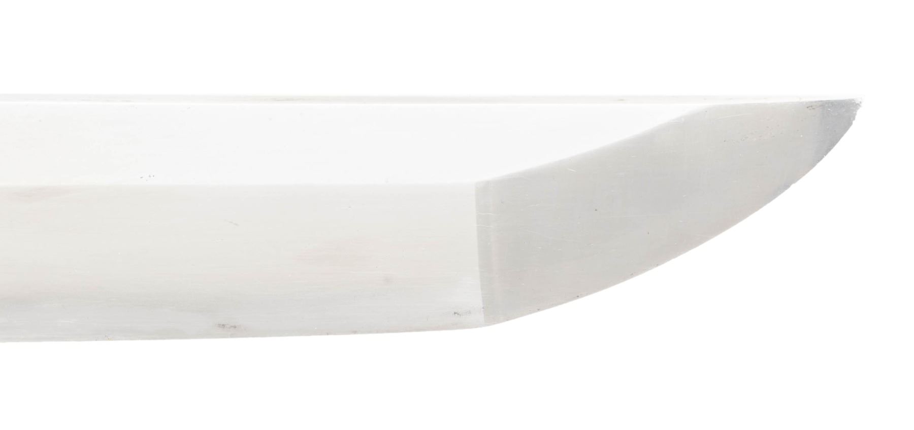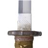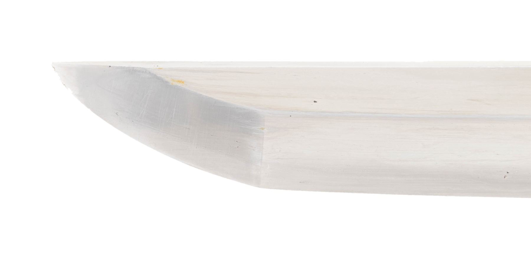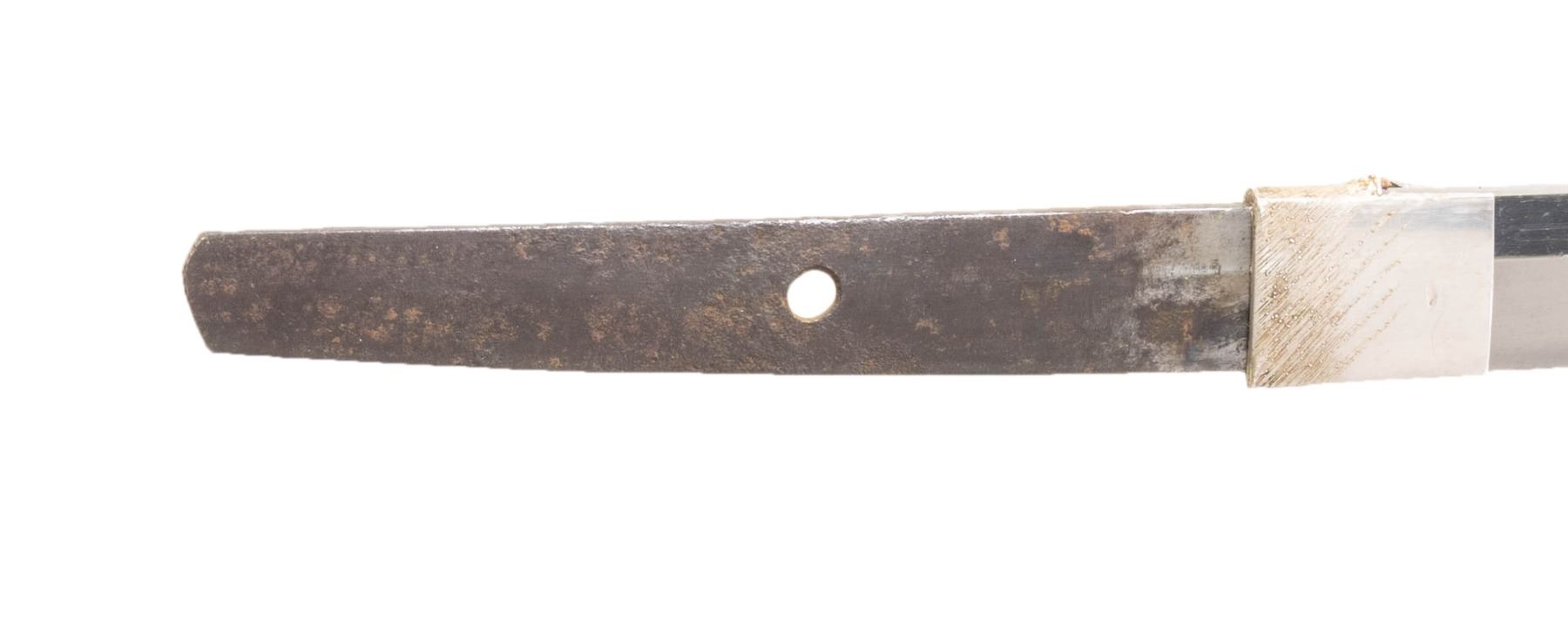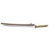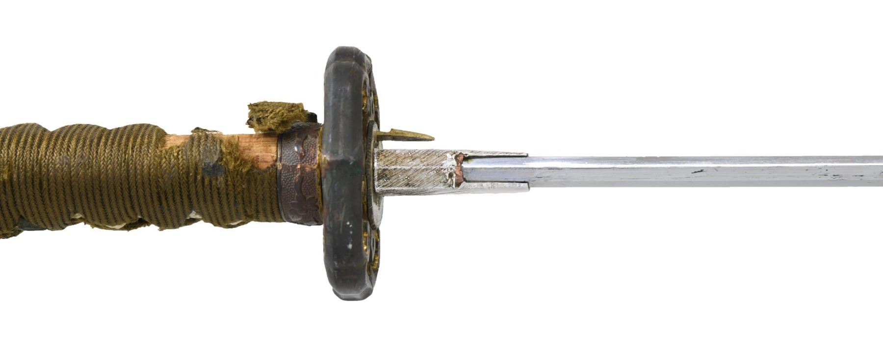 Overall length: 36 3/4". Blade length: 25 3/8". Blade has a straight hamon with a heavily silvered copper habaki with incised diagonal, lineal decoration. The blade has a 4-character signature near the mune just in front of the habaki. The nakago has a single mekugi-ana and is not signed. There are two seppa above and below the 4-cherry blossom gilded tsuba. The tsuka has a matching fuchi and kabuto-gane with white same. There is a brown tsuka-ito with gilded brass 3-cherry blossom menuki. Classic military saya with gunto mounts and a brown-painted finish. CONDITION: the blade has a fine polish with no notable flaws. The tsuka-ito is quite frayed, possibly from insect damage; otherwise, the tsuka is complete. The saya actually shows light wear overall. (02-23600/BF). NON-GUN. $600-900.