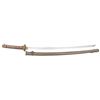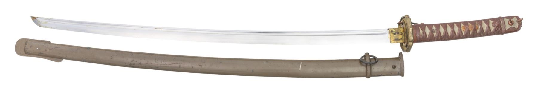 A nice shin-gunto NCO katana measuring 38 1/4" overall with a 27 1/2" blade. Blade has a no discernable hamon and shoes full length hi and is serial numbered "32743". Gilded brass habak i. The nakago can not be view as the tsuka can not be removed. The gilded brass tsuba is of standard form with a pebbled finish on both sides. There is one seppa above and below the tsuba. Plain fuchi with a Kokura stamp. One piece painted metal tsuka with integral kabuto-gane. Olive green/brown painted metal scabbard with one suspension ring. CONDITION. blade actually has a nice polish. Tsuke shows very light wear as does the saya. (02-24103/BF). NON-GUN. $500-750.
