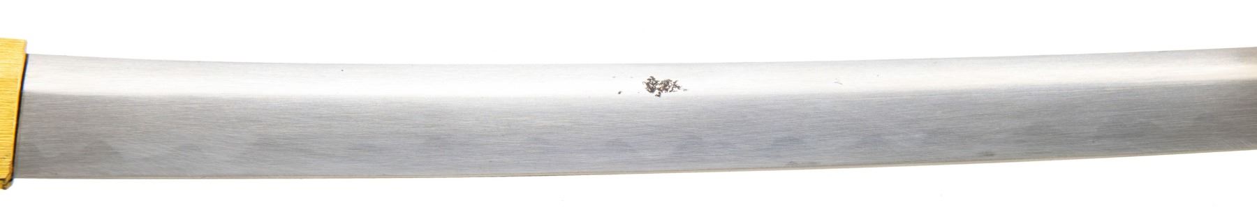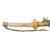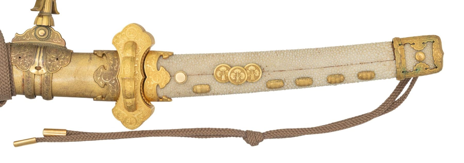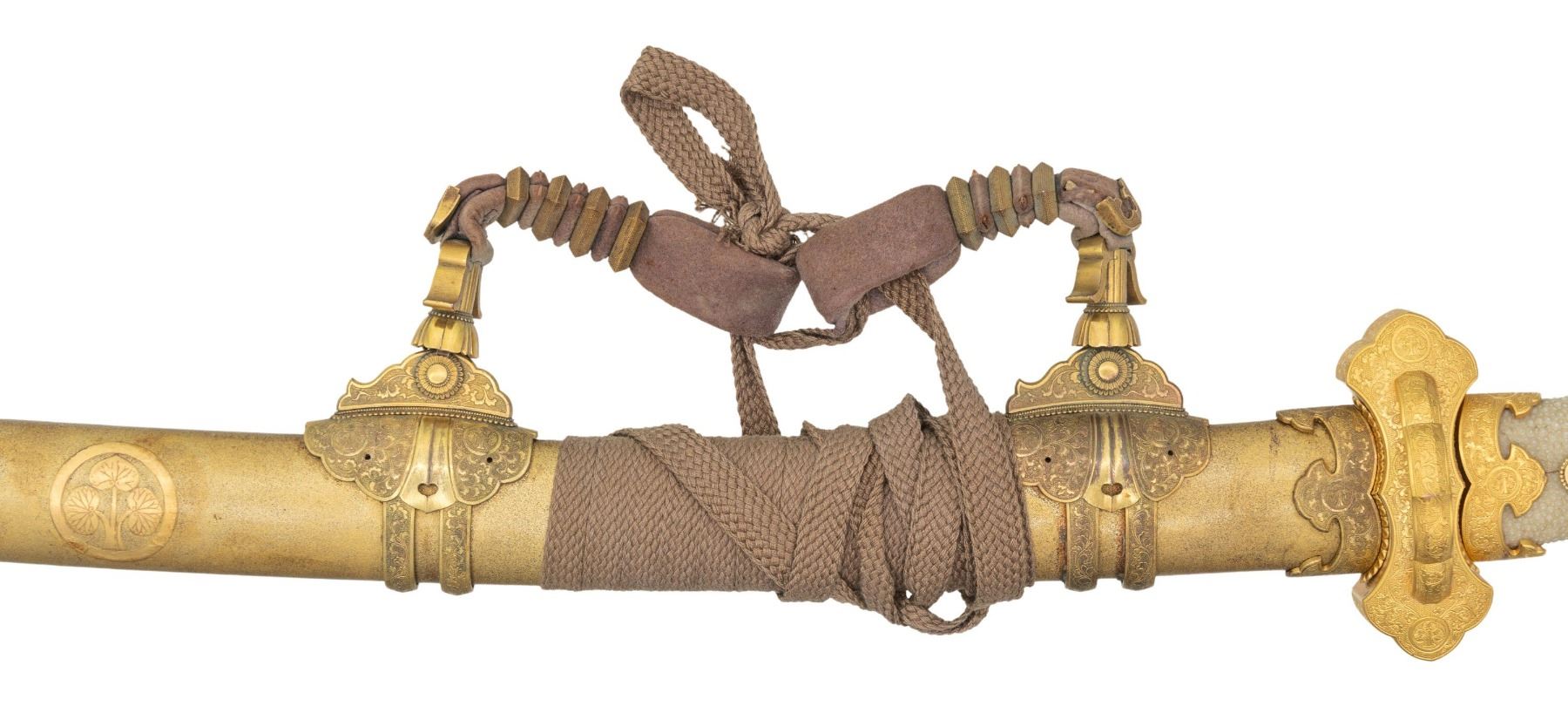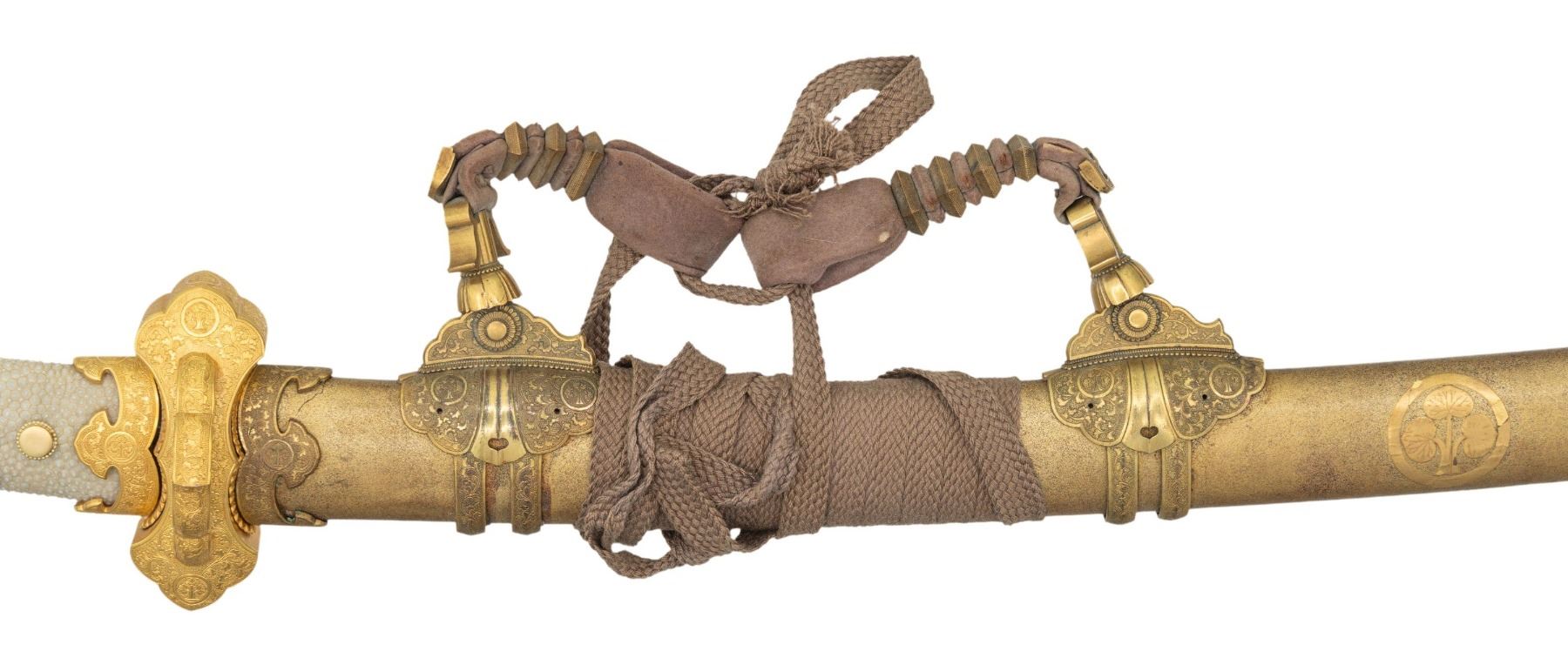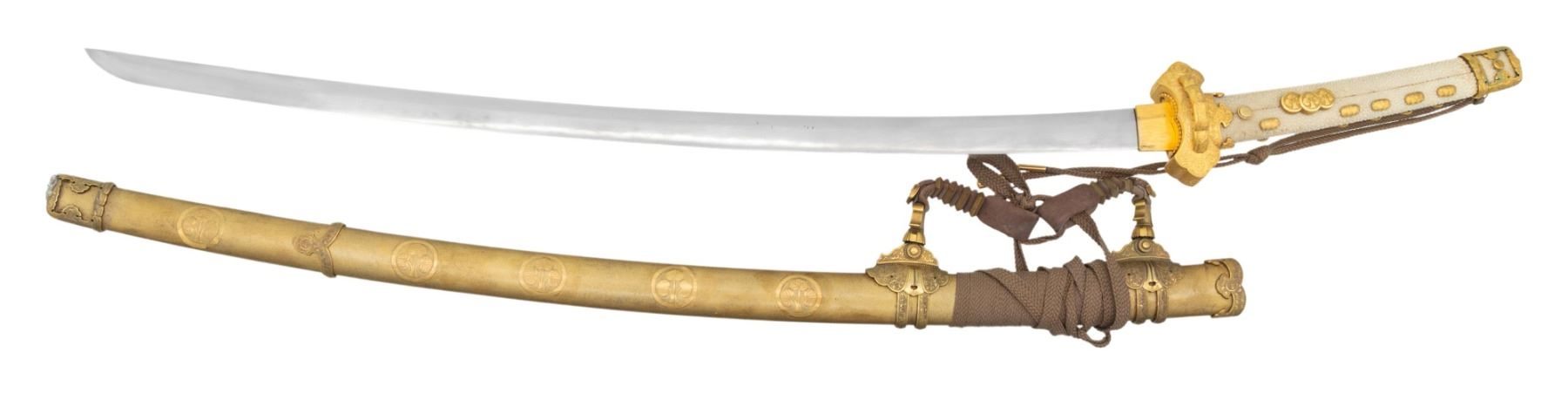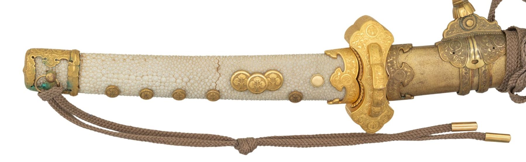 This attractive heavily gilded tachi measures 40 1/8" overall with a 27 1/2" blade. The blade has an irregular hamon with a gilded brass habaki. The tsuba is actually a tachi style crossguard for a court sword with a heavily gilded finish featuring foliate engraving and a family mon that depicts a three branched tree. There is a bracket on either side likely for suspension. There is a heavily gilded seppa above and below the crossguard. The nakago has three character signature on one side with a single mekugi-ana. The tsuka has heavy gilding on the matching fuchi and kashira that also matches the crossguard. The menuki consists of three gilded family mon together. There are five other studs in the white same that feature a family mon on one side and an oval stud on the other. The saya has a gold finish with shin-gunto style mounts and five large gold foil family mon on each side. The sageo is quite ornate and is also heavily gilded. CONDITION: the blade has a very fine polish with one tiny spot of oxidation. The tsuka retains nearly all of its original gilding with a few touches of verdigris on the kabuto-gane. The same has a fairly tight drying crack at the mid-point. The original capped mekugi is present but not in the sword because the caps are loose and prone to loss. The saya shows general light wear. (02-25811/BF). $3000-5000.