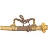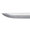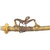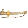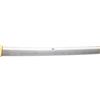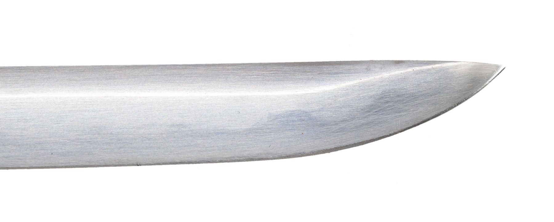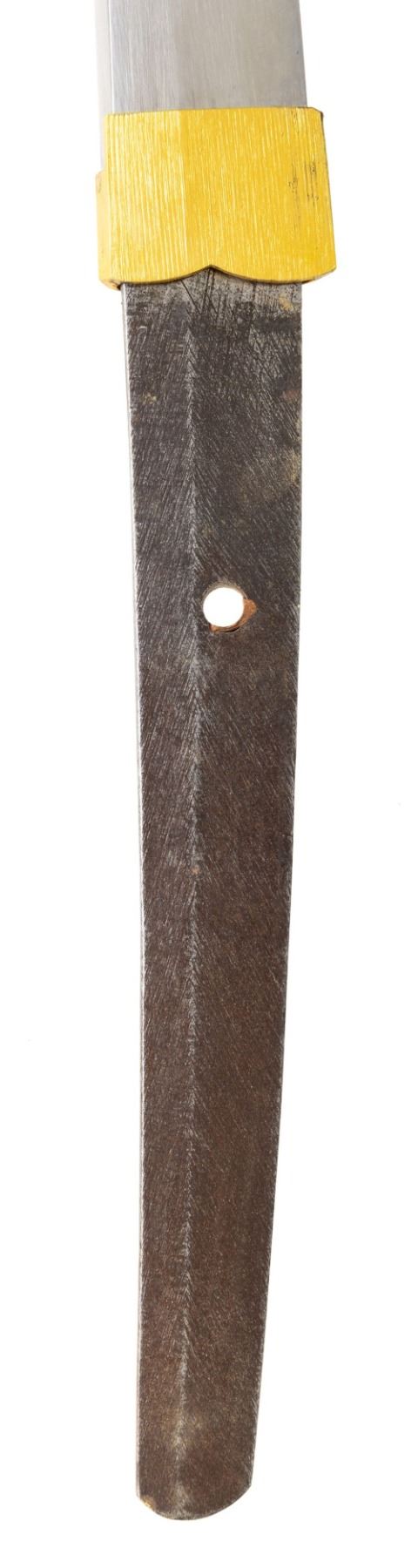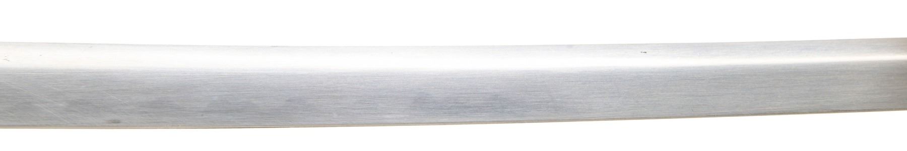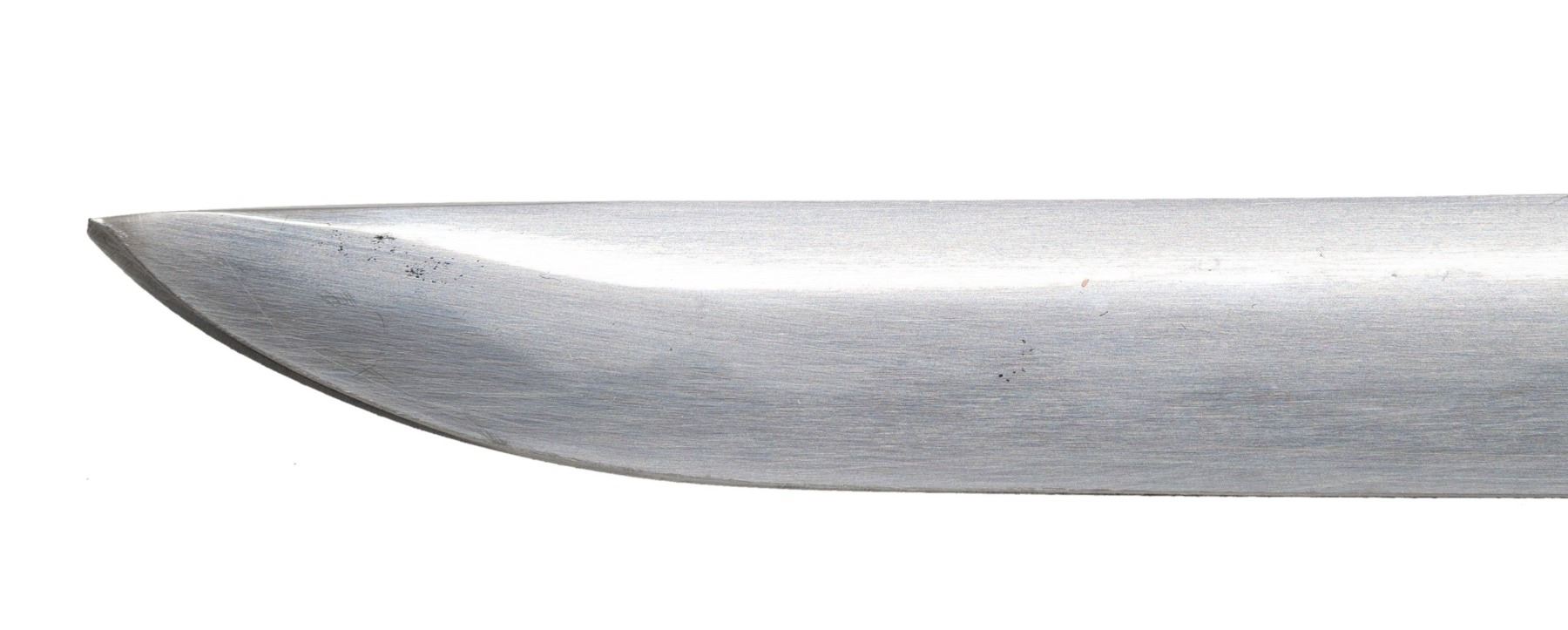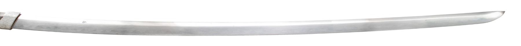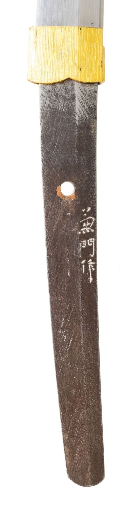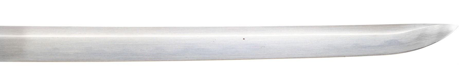 This attractive heavily gilded tachi measures 40 1/8" overall with a 27 1/2" blade. The blade has an irregular hamon with a gilded brass habaki. The tsuba is actually a tachi style crossguard for a court sword with a heavily gilded finish featuring foliate engraving and a family mon that depicts a three branched tree. There is a bracket on either side likely for suspension. There is a heavily gilded seppa above and below the crossguard. The nakago has three character signature on one side with a single mekugi-ana. The tsuka has heavy gilding on the matching fuchi and kashira that also matches the crossguard. The menuki consists of three gilded family mon together. There are five other studs in the white same that feature a family mon on one side and an oval stud on the other. The saya has a gold finish with shin-gunto style mounts and five large gold foil family mon on each side. The sageo is quite ornate and is also heavily gilded. CONDITION: the blade has a very fine polish with one tiny spot of oxidation. The tsuka retains nearly all of its original gilding with a few touches of verdigris on the kabuto-gane. The same has a fairly tight drying crack at the mid-point. The original capped mekugi is present but not in the sword because the caps are loose and prone to loss. The saya shows general light wear. (02-25811/BF). $3000-5000.