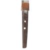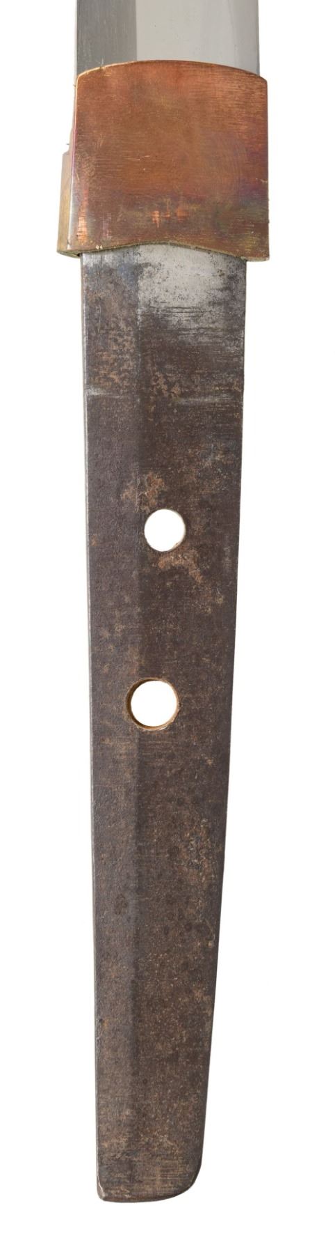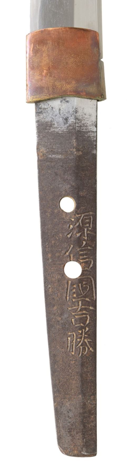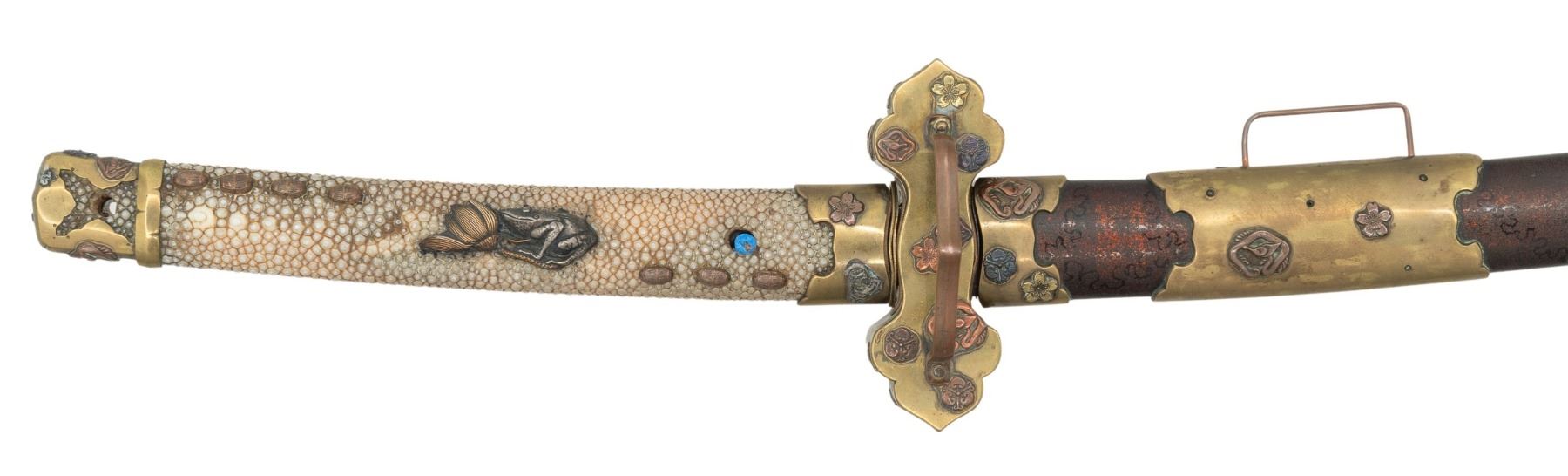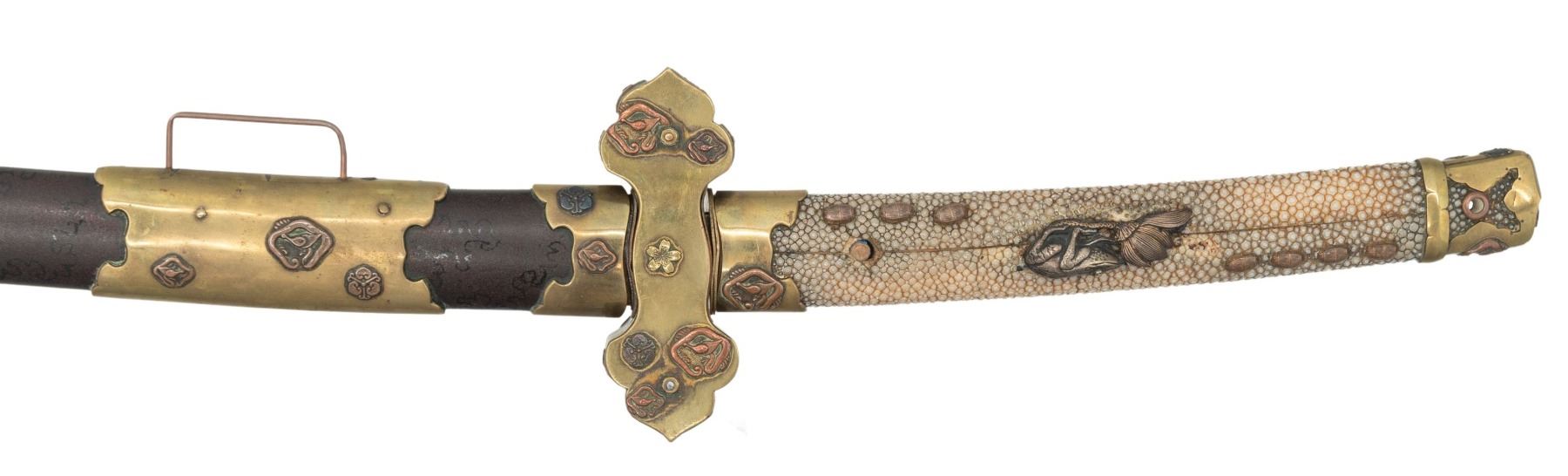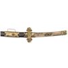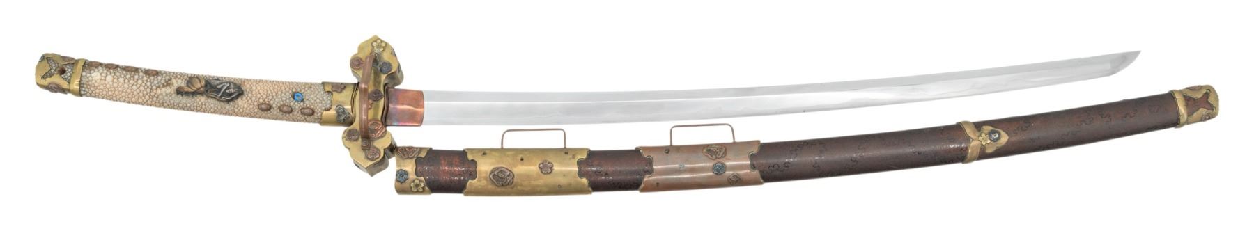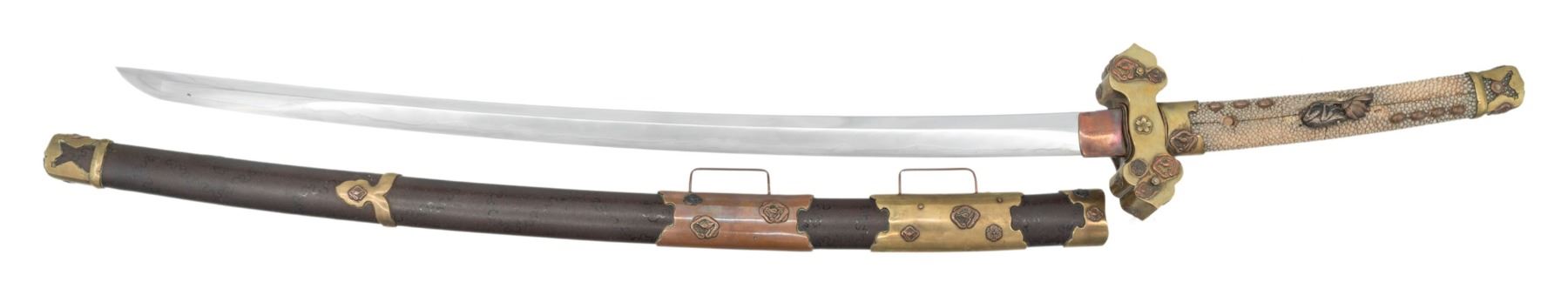 This fascinating tachi measures 39 1/4" overall with a 25 5/8" blade with an irregular hamon and a copper habaki. Replacing the normal tsuba is a heavy brass crossguard showing western influence. The crossguard is decorated with several mon and three cherry blossoms. There is a copper pointed bar on one side likely to aid in carrying the katana. There are two seppa below the tsuba and three above. The nakago has a two mekugi-ana indicating use of an ancestral blade. One side of the nakago has a five character signature. The tsuka has a brass fuchi and kashira decorated in a similar manner to the crossguard. It is covered in white same with a frog and lily pad flower menuki on each side. There are four small bronze ovals above and three below the menuki. There is no tsuka-ito. The wooden saya has five brass mounts in a stylized gunto form. The mounts are decorated with mon and cherry blossoms similar to the crossguard, fuchi and kashira. A highly unusual tachi with impressive decoration and a truly superior blade. CONDITION: The blade is in exceptional polish. The tsuka shows light wear. The saya also shows light wear overall and has no visible damage. (02-25814/BF). $2000-3500.