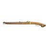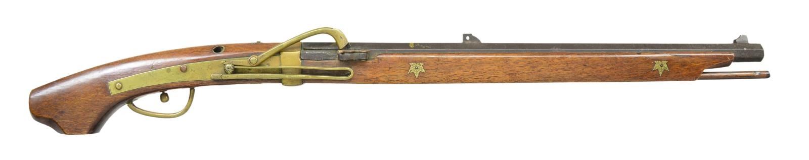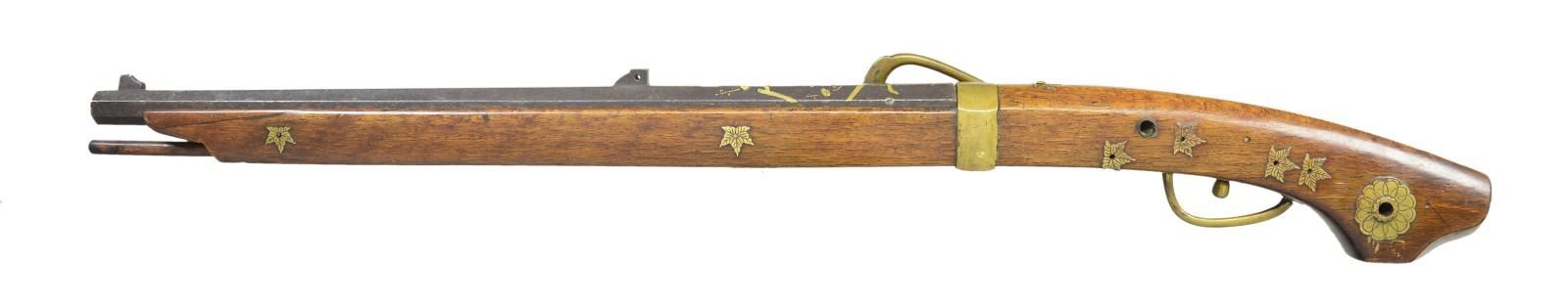 Cal. 40. NSN. Tapered oct. 18 1/4" bbl. w/ raised bead front & groove rear sights. Top of bbl. behind rear sight has brass colored inlaid ornamentation to include trees, vines & cherry blossoms. Brass matchlock action w/ stud trigger. Iron pan has brass swivel cover. Hardwood stock decorated with 14 maple leaves, 1 ornate medallion on bottom forward of trigger guard & 1 geometric pattern on left stock to hold cord. Club style butt has heelplate. Wooden ramrod. CONDITION: bbl. has fair corroded patina appearance w/ peppery oxidation throughout. Brass has pleasing mustard patina w/ handling marks. Lock is unable to stay in cocked position has trigger bar is broken. Bbl. band has loose play. nose area has 2 splices 4" long. Sanded & refinished wood has good appearance w/ impressions & scratches. Dark pitted bore. PROVENANCE: From the Lifelong Collection of Glen E. Mattox. (01-22459/MD). ANTIQUE. $1,200-1,500.