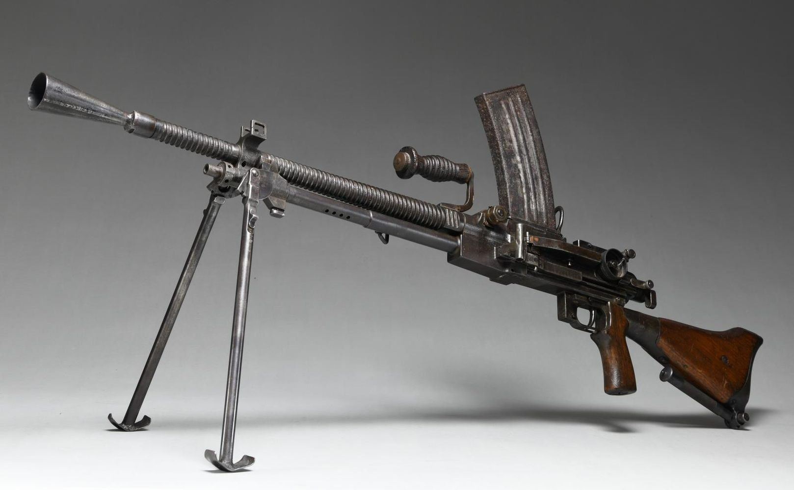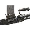 Cal. 6.5mm. S# 18167. Bbl. 22". Mfg. November, 1944. The Japanese Type 96 was introduced in 1936 intending to replace the Type 11 LMG. The Type 96 deleted the hopper feed mechanism of the Type 11, instead using a top mounted box magazine, very similar in appearance to the British Bren. The Type 96 also deleted the cartridge oiling system on the gun and instead integrated it w/ the mag loader. The bipod was also improved, having a few degrees of swiveling travel, over the prior rigid offerings. Many of the revisions allowed much quicker barrel changes at a weight of 2 pounds lighter than the Type 11. Opposite of the Type 11, which had sights that were offset to the right side, due to the obstructive hopper feed mechanism, the sights on the Type 96 are offset to the left, since the magazine is mounted on top, in the center of the receiver. The ammunition for the Type 96 remained the reduced loaded 6.5mm cartridge. It utilizes a non-reciprocating charging handle on the left side of the receiver to charge the gas operated, open bolt system, retaining an adjustable gas port. The circular cooling fins on the barrel taper in diameter from 1.4" down to just under an inch towards the muzzle. The muzzle is threaded and employed a cone style flash hider. Like its predecessor it has a wooden carry handle mounted forward of the front trunnion. The sights consist of a protected front blade & a windage adjustable rear peep, also adjustable in elevation from 200 to 1500 meters. The shoulder stock is manufactured from a combination of steel & hardwood, incorporating a folding monopod to help steady long shots. It is mounted to the rear of the pistol grip in a much more traditional fashion than the Type 11. Just rear of the front sight is a rear folding bipod w/ 14" legs that has 2 positions for firing extended. Receiver markings include Kokura Arsenal mark, on the right, as well as the serial number, above "19.11" indicating Showa Era Year 19, 11th month, translating to the manufacturing date of November 1944. MAGS: 1 30 rd. UNATTACHED ACCESSORIES: Photo copied operation manual in Japanese. CONDITION: Finish on exposed metal surfaces is a mix of black to brown, coverage at about 50% w/ scattered patina throughout. It has been dewatted primarily by welding a rod into the chamber of the barrel but were extremely gentle to the interior of the receiver, apparently removing it prior to plugging. Since the Type 96 utilized a quick change barrel, the latch has been welded over the takedown pin. The magazine has succumb to significant corrosion but still locks in the mag well. Wooden furniture looks period correct, w/ several small chips & impressions, retaining structural integrity. Fire control mechanism appears to function correctly when cycled by hand. NATIONAL FIREARMS ACT DEWAT MG REQUIRING BATF TRANSFER BEFORE TAKING POSSESSION. FULLY TRANSFERABLE.(03-1634/JZ). CURIO CLASS III. $6,000-9,000.