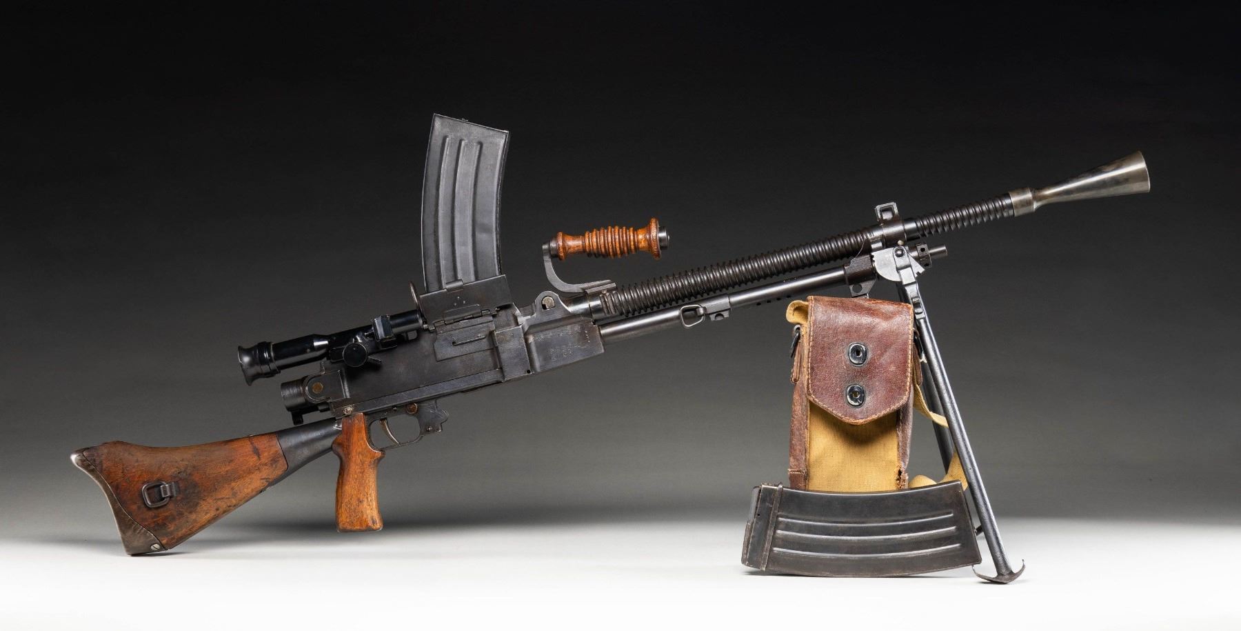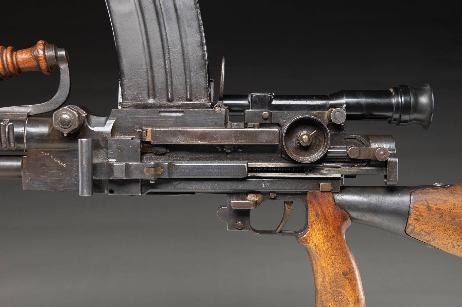 Cal. 7.7mm. S# 12240. Bbl. 21 1/2" dated March, 1944. Standard 99 LMG sights with drum adjustable rear. Receiver mounted Tomioka made T99 2.5x13 scope numbered "5638". Rubber eyepiece is present. Scope has T99 reticle with cloudy optics. Very fine example of the famous WW2 Japanese Type 99 machine gun made by Hitachi. Matching numbers on receiver, bbl., mag cover, bolt, locking piece, bbl. nut & gas regulator. Rear sight drum & small parts are mismatched. Other visible parts appear unnumbered. Bbl. shows evidence of rewat & shim is a later non-Japanese replacement. Right side of receiver has Kokura, Hitachi & T99 markings. Receiver also has 19.3 Showa date for March, 1944. Flash hider present that consignor states was a repro made by Bart Rust. Blued finish. Asian hardwood stock without monopod provision, pistol grip & grooved carry handle. Folding bipod present. This machine gun was a souvenir of Clayton Decker, a machinist mate who served on the USS Tang. The Tang was a famous Balao class submarine that sank 33 Japanese ships totaling 116,454 tons making it the most successful American sub of the war . On its Fifth War patrol in October, 1944 the Tang was sunk when it fired an MK18 torpedo curved around, hitting the sub astern & exploded. Out of 87 crewmen on the Tang, only nine survived including Decker & the skipper Richard O'Kane. The survivors were picked up by Japanese ships & taken prisoner. Decker was eventually taken to Omori prison camp where his cellmate was the famed USMC fighter ace Greg "Pappy" Boyington of Black Sheep Squadron fame. Submariners were accused of war crimes by the Japanese & thus treated worse when captured. One of the nine survivors died in captivity & all were beaten & tortured. In late August, 1945 Omori was liberated by Allied troops The released prisoners were to be flown out by C54 but prior to their departure they were allowed to pick souvenir from a Japanese hanger near the camp. Decker picked a few items including this T99 machine gun. Due to his poor physical condition, Decker was unable to carry the mg but his Pappy Boyington loaded it on the aircraft. Decker would return to Colorado in 1947 & also be awarded the Silver Star. Years later one of Decker's sons would use the gun as a toy & cause police to be called. The gun was seized but the ATF allowed the gun to be returned as dewat. In the early 1990's, with no interested heirs Decker offered the gun to the Vice President of a Military Weapons Collectors club a man named Bud Steffen. After going through the legal paperwork. Bud owned the weapon for a few & later sold it to the consignor who in turn had it reactivated by a man named Bart Rust. MAGS: 2-30 rd. black enamel finish & both appear to be numbered "761". UNATTACHED ACCESSORIES: T99 canvas mag pouch & letter from Bud Steffen Design detailing the history of Decker, the USS Tang & the gun. CONDITION: stock set & carry handle appear cleaned with minimal Urushi finish present, a small crack behind upper tang, scattered dings & handling marks. Repro flash hider shows overall gray discoloration. Balance of metal retains 60% original blue with pitting along bipod legs, some improper disassembly wear around lower pin, scattered oxidation, some touch up around rear of bbl. front of receiver from rewat, notable discoloration around receiver from reweld, a small spot that appears to be rewelded behind Kokura receiver marking & overall fading. Action functions properly when hand cycled. Very good plus bright bore with strong rifling. (03-1899/MJC). THIS IS A NATIONAL FIREARMS ACT CURIO & RELIC REQUIRING BATF TRANSFER BEFORE TAKING POSSESSION. FULLY TRANSFERABLE. $8,000-12,000.