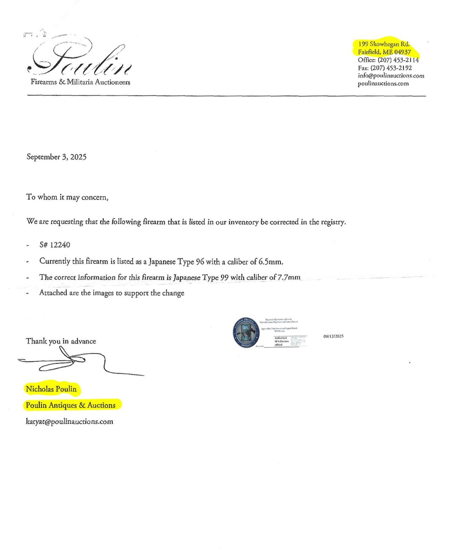 3) 1 ATF Form 5330.20 Certificate of Compliance and the appropriate BATFE Form completed in duplicate including the signature of your local Chief Law Enforcement Officer. Poulin Antiques & Auctions, Inc. will supply all the proper forms upon acceptance of your winning bid.