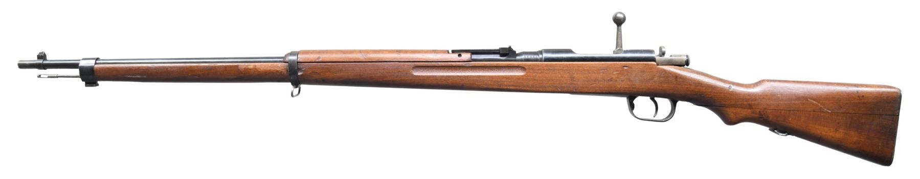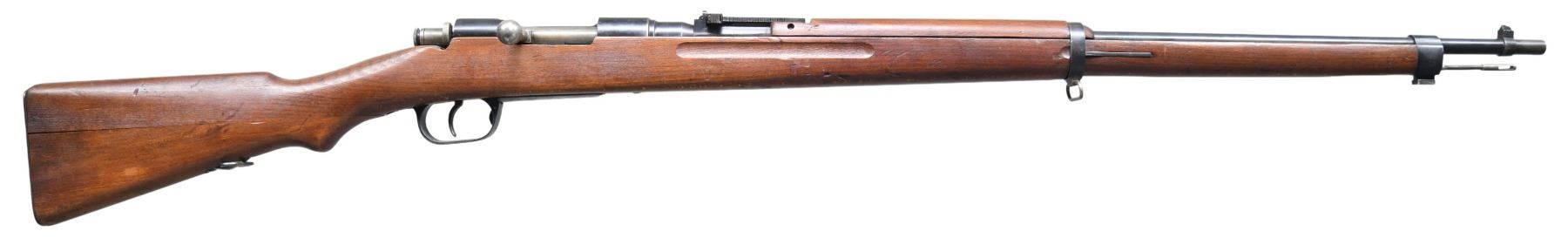 Cal. 6.5 Jap. S# A1986. Bbl. 31 3/8". Blade front sight. Ladder rear sight graduated to 2400m. Italian made rifle Japanese rifle. Type I rifles were used mostly by the Japanese Navy & notably at the Battle of Kwajalein Atoll. Blued finish. Beech stock set with two piece butt & bottom mounted sling swivels. Cleaning rod present. CONDITION: stock set shows scattered dings & handling marks. Metal retains 70% original blue with scattered light oxidation, edge wear, handling wear, floorplate & band keeper turning silver. Action functions properly when hand cycled. Very good bright bore. (25-3857/MJC). CURIO. $400-600.