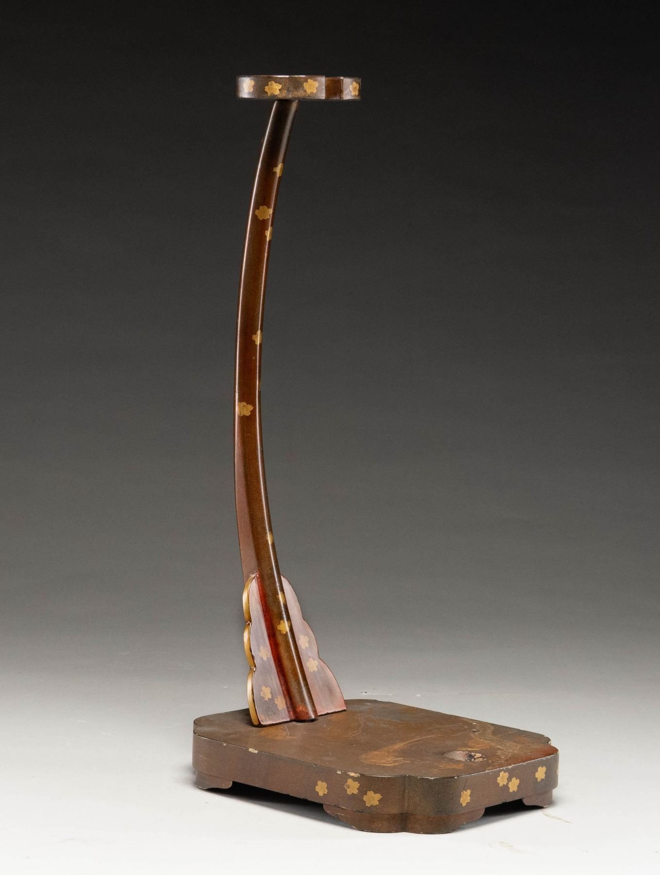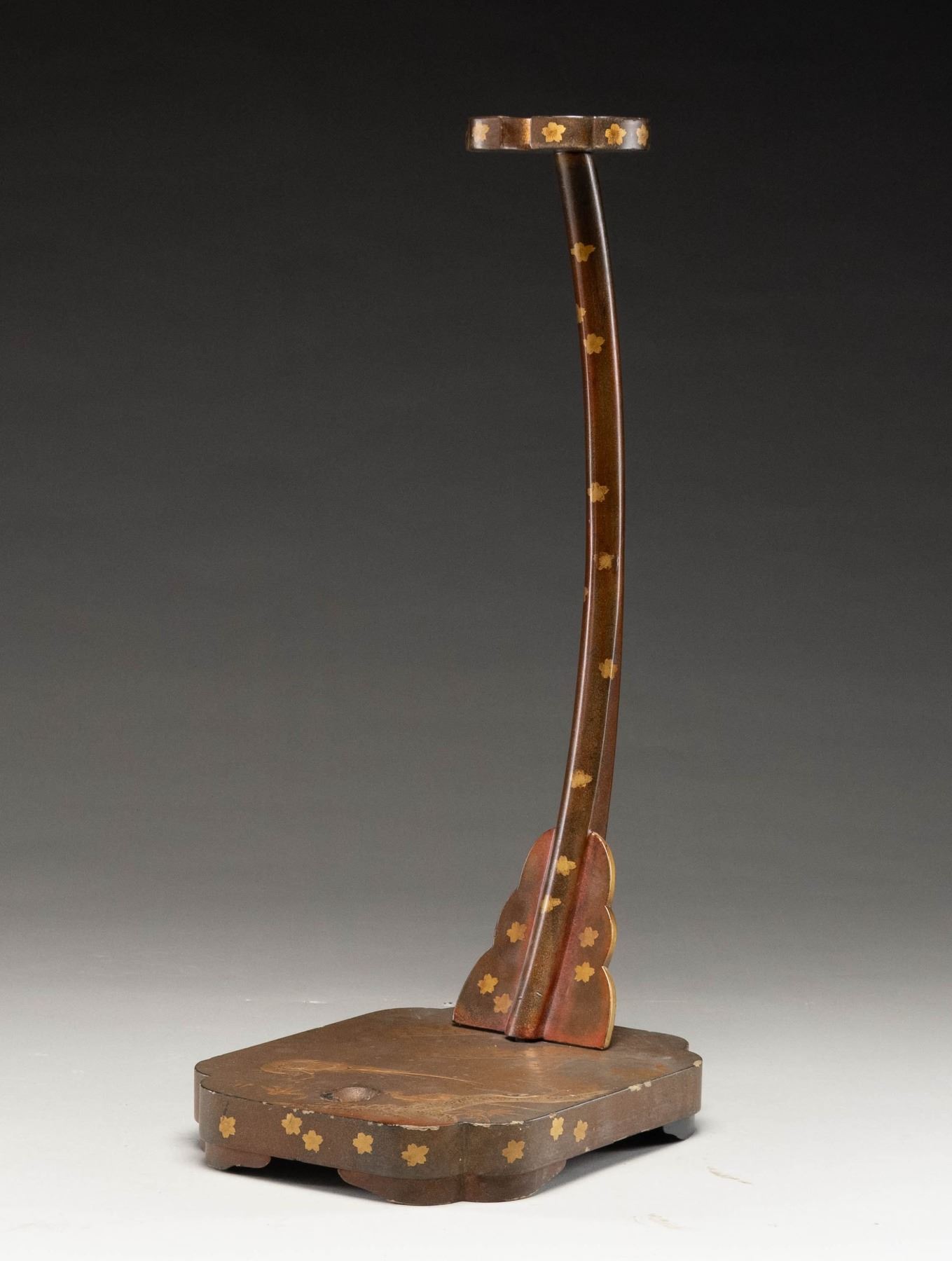 This kakedai measures 25 3/4" in height on a base that measures 12 1/2" x 10". It is decorated with copper colored spatter over a black enamel finish. There are several gold leaf cherry blossoms on the top, the shaft and around the front of the base. The base is decorated with gold peacocks with an ancient cherry tree to the right. CONDITION: The kakedai shows overall light to moderate wear with some chipping to the edges. The base is a bit faded likely from exposure to sunlight. (02-25823/BF) $300-500.