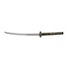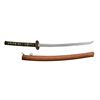 Overall length: 37 1/4". Blade length: 20 1/4". Blade has no apparent hamon. No habaki. Iron tsuba w/ mountainous design. There is 1 brass seppa above & below the tsuba. Nakago has a single mekugi-ano. There is no signature on the nakago. Matching fuchi & kashira. Black tsuka ito w/ partial white same & a single menuki showing a running rabbit. Saya appears to be wood but it is completely covered w/ brown leather. CONDITION: blade has a fine repolished finish w/ a few scattered lamination flaws. There are no chips to the edge. Tsuba has an ancient dark patina. Same is about 60% complete. Tsuba & tsuka are loose due to the missing habaki. Tsuka has been rewrapped. Saya cover is pliable. PROVENANCE: Estate Collection of Jack Verret Sr. (02-16482/BF). $300-500.