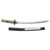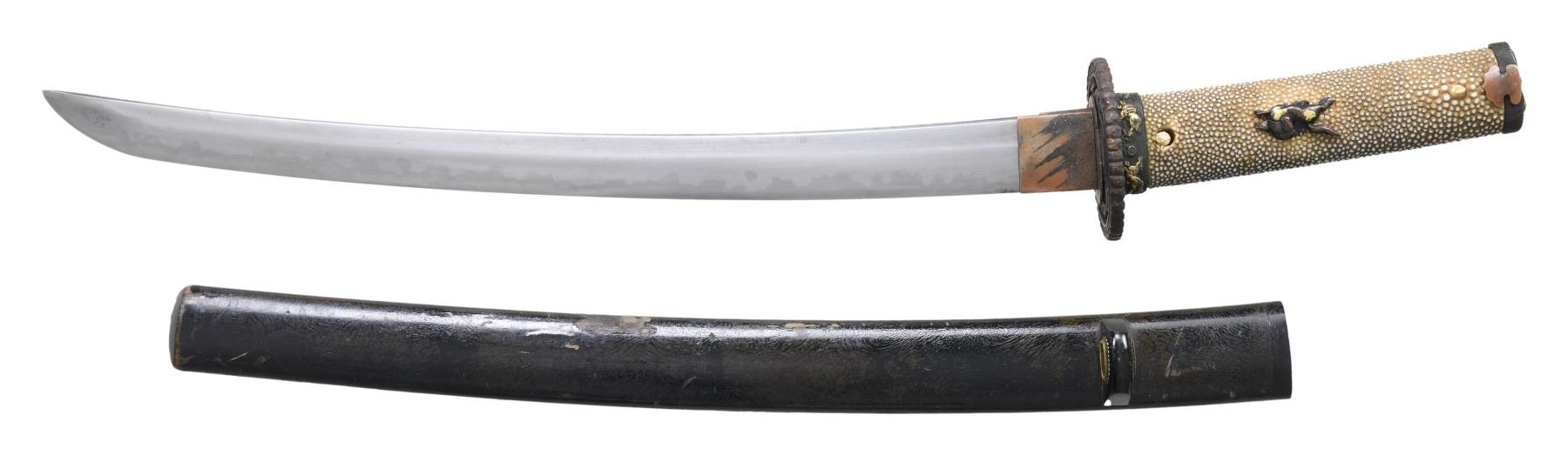 Overall length: 20 3/4". Blade length 14 1/4". Blade has a very irregular hamon with a copper habaki showing diagonal spires. There is 1 seppa above and below the very ornate openwork iron tsuba. The nakago has a single mekugi-ana with a 13 character signature on one side and a 12 character signature on the other. All matching gold inlaid fuchi, kashira and menuki. Tsuka has white same but no tsuka-ito. Saya is black enameled wood with a missing kogatana. CONDITION: blade has a good polish with no faults. Tsuka shows wear and the tsuka-ito is missing. Saya shows light overall wear. Saya has a taped on tag that reads, "bizen osafune ju yokoyama kaga suke fujiwara sukenaga" & "1830/1854". (02-24497-1/BF). $500-750.