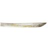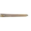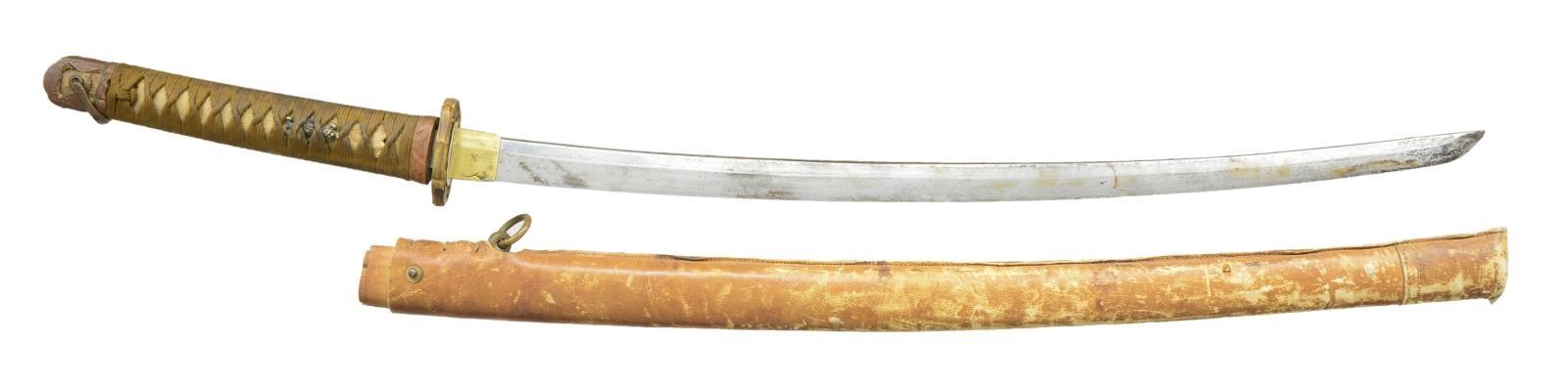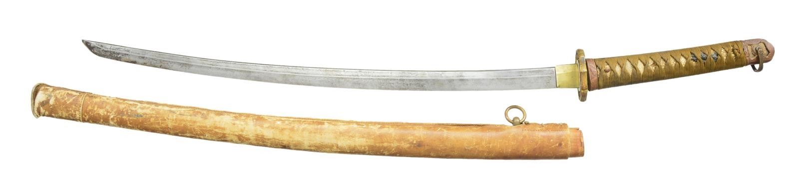 Brass furniture with cherry blossoms on tsuba. Wood scabbard w/ leather covering. CONDITION: blade has cleaned patina appearance w/ no flaws to edge & cracked brass support. Wooden scabbard shows missing piece in exposed portion along w/ worn finish throughout leather cover. (02-18102/MD). $300-400.