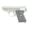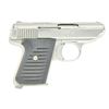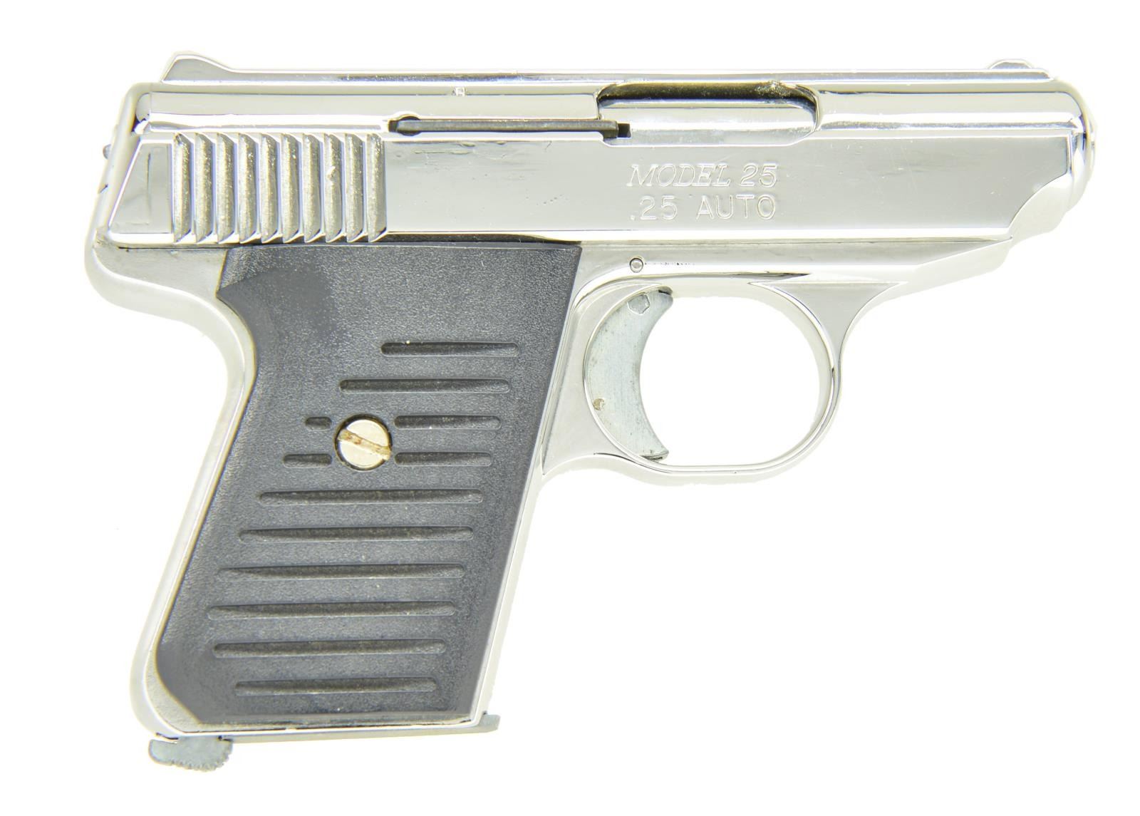 Cal. 25 ACP. S# 027122. Bbl. 2 1/2". Nickel finish. Black plastic grips. MAGS: 4 - 6 rds. UNATTACHED ACCESSORIES: Jennings box. CONDITION: very good overall w/ light marks. Very good bores. PROVENANCE STATEMENT: Estate collection of Thomas F. Wolfinger. (22-6154/MD). MODERN. $40-60.