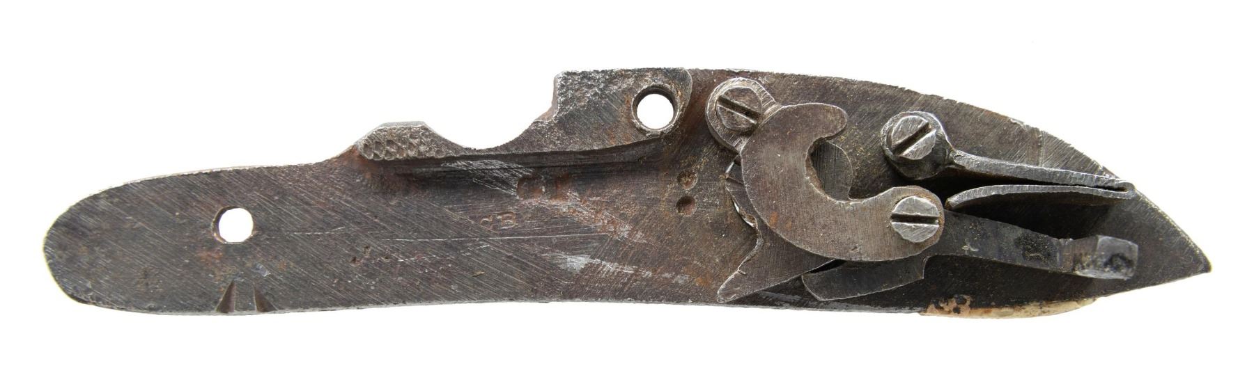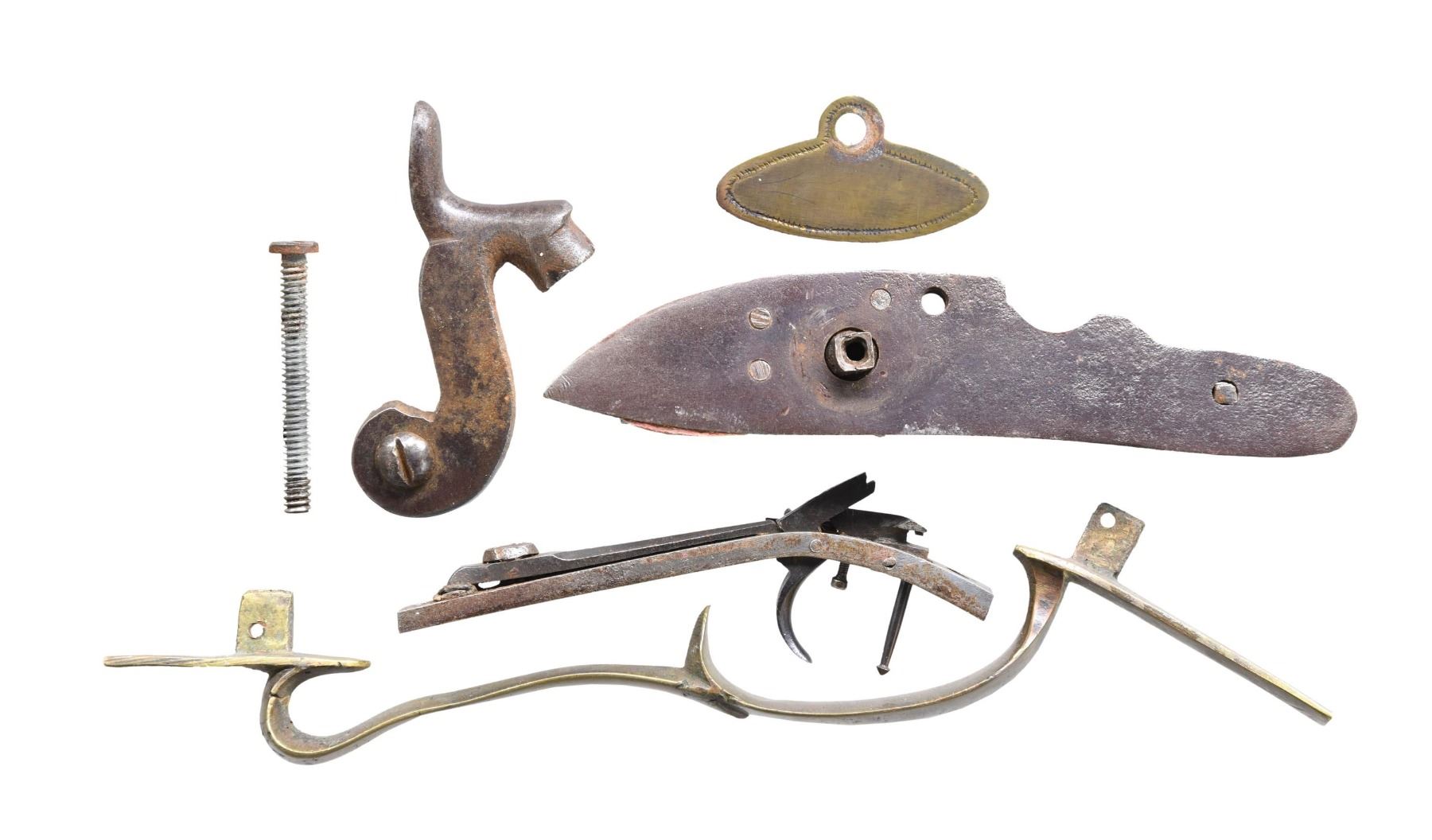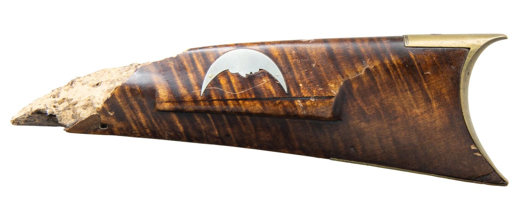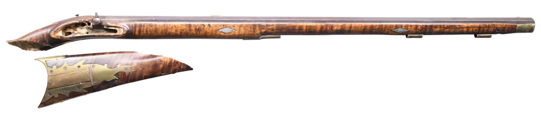 Cal. 50. NSN. The octagon 35 1/2" barrel has a German silver blade front sight and a large brass dovetailed base for the rear sight; the rear sight is broken off and missing. Bolster-style breech. Double-set triggers: front is straight and rear conventional is set. Full-length wedge-fastened maple stock with brass patchbox, finger-curl trigger guard, and crescent buttplate. German silver ornamentation includes four diamonds on the forearm, a diamond on the wrist, and a man in the moon on the cheekpiece. CONDITION: barrel & lock have a brown patina appearance mixed with pitting and corrosion, with several noticeable impact dents on the barrel. Stock has been irreversibly split into 2 pieces with triggerguard assembly bent. Lock is missing components and bent. Bore has strong rifling, showing pitting throughout. (01-25758/MD). ANTIQUE. $100-200.