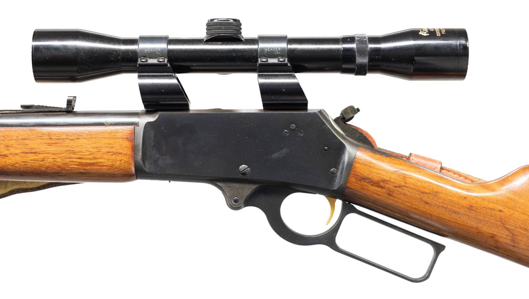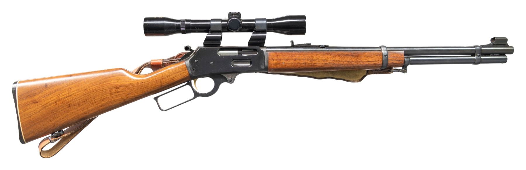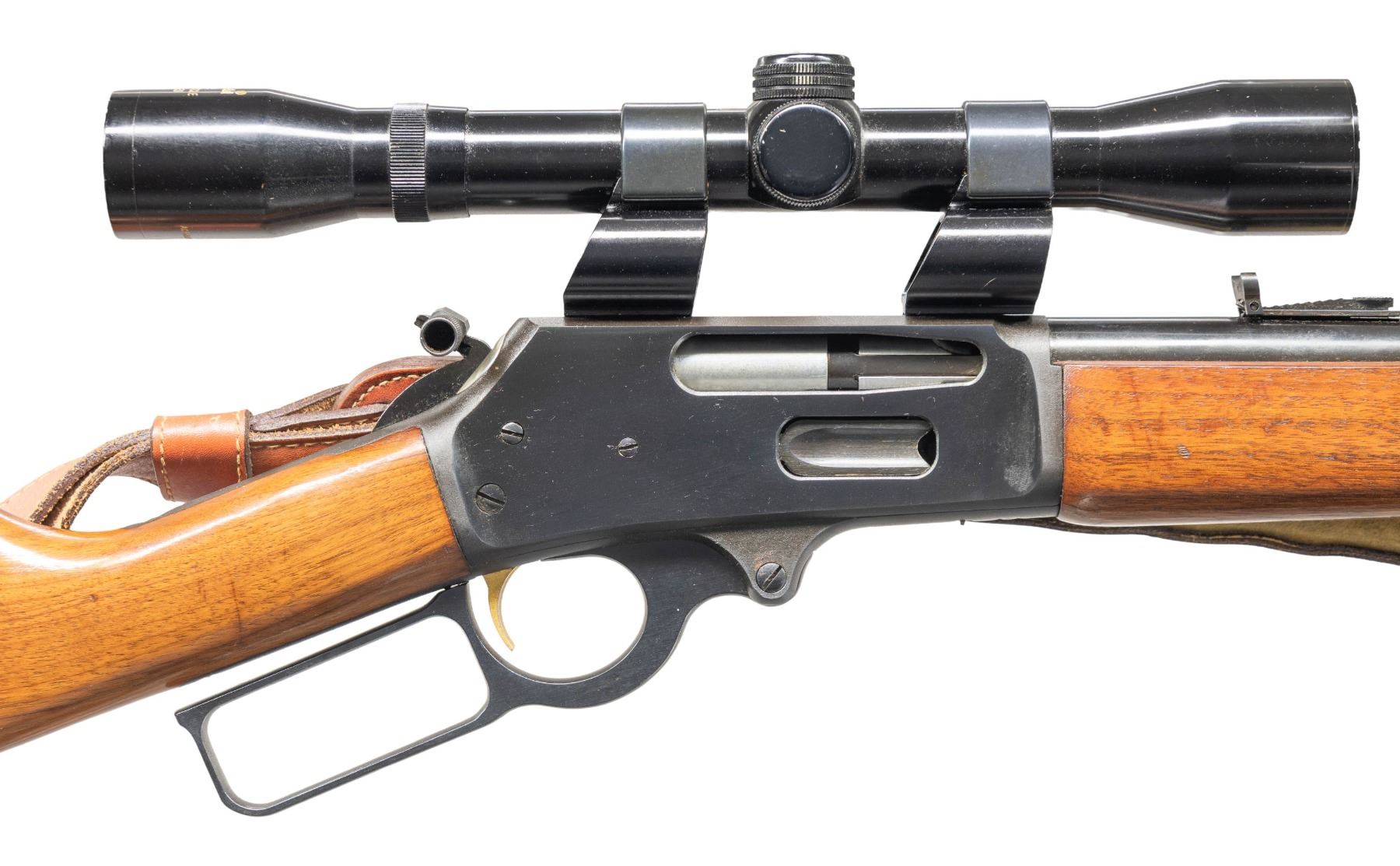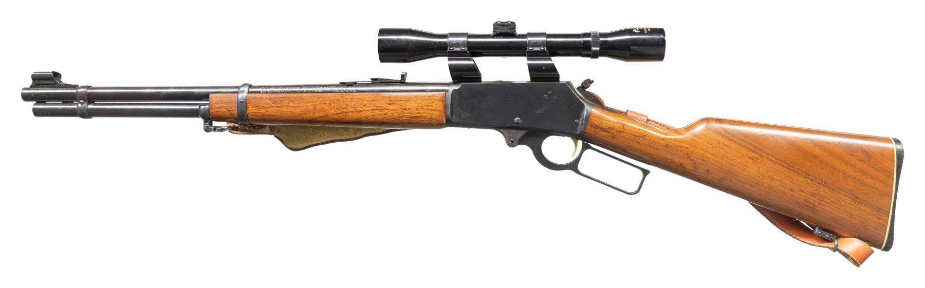 Cal. 30-30 Win. S# 20025442. Mfg. 1980. Micro-groove 18.5" bbl. Sporting sights. Glenfield 4x32 scope on see through rings. Pre-CBS action w/ hammer extension. Walnut stock set. Brown leather sling on added swivels. CONDITION: very good to near excellent overall appearance with light wear. Very good rifling. Very good scope with serviceable optics. (25-4827/MD). CURIO. $300-500.
