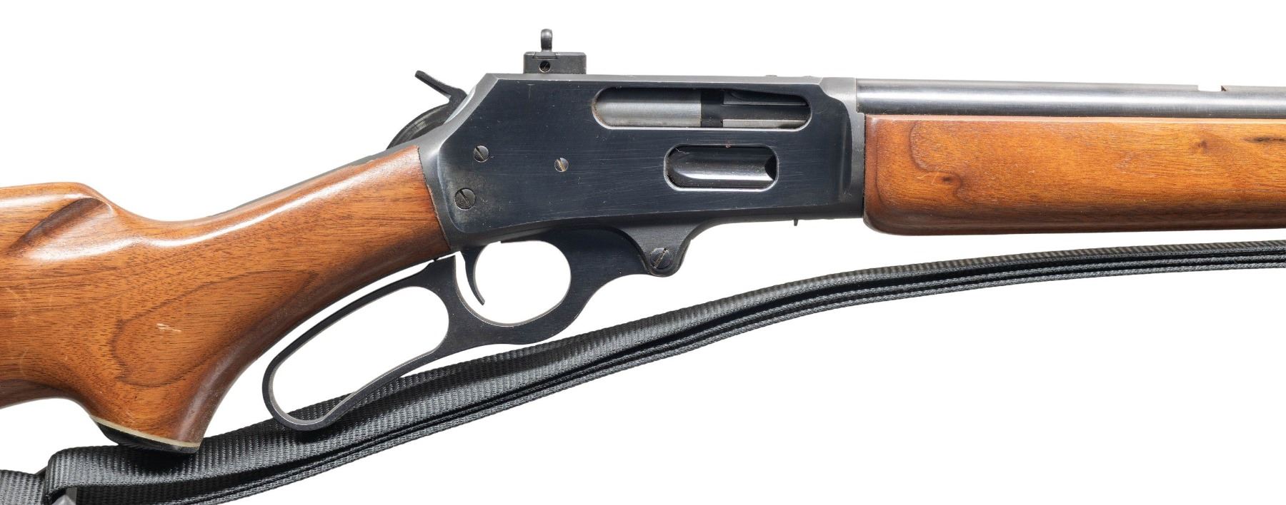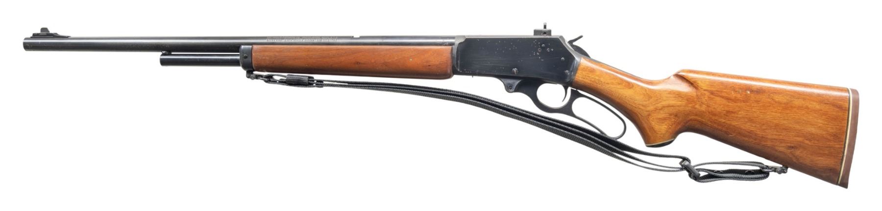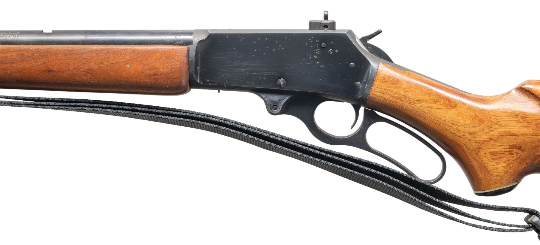 RIFLE. Cal. 444 Marlin. S# 18048006. Mfg. 1982. Micro-groove 22" bbl. Replacement white bar front sight, open rear dovetail & ghost ring receiver sight. 5 Shot tubular mag. Blued finish. Walnut stock set with Marlin pad & black nylon sling. CONDITION: good blue with peppery oxidation throughout & large portion of fading finish on top of barrel. Good wood finish with handling marks. Very good bore with areas of fouling forward of chamber. (25-3595/MD). MODERN. $500-750.