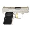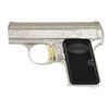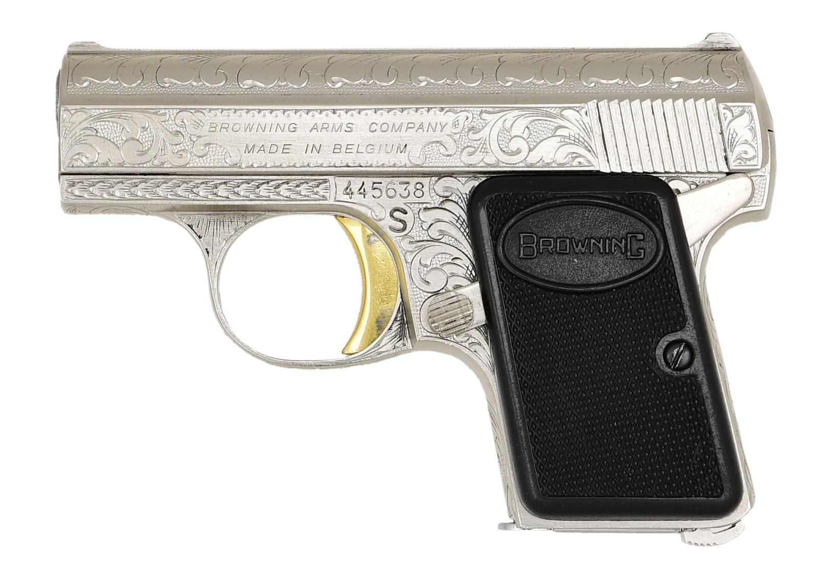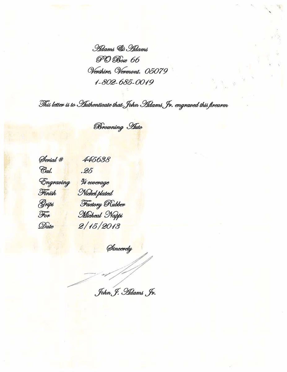 SEMI-AUTOMATIC PISTOL. Cal. 25 ACP. S# 445638. Bbl 2 1/8". Baby Browning semi-automatic pistol manufactured in Fabrique Nationale in 1968 and subsequently engraved by John Adams Jr. of Adams & Adams in Vershire, VT. The left side of the slide is stamped "BROWNING ARMS COMPANY/ MADE IN BELGIUM" with Belgian proofs stamped on the front. Frame and receiver feature near full coverage, finely engraved scrollwork on a punch dot background. Underside of frame is engraved with John Adams Jr.'s "JA" signature just ahead of the trigger guard. Major metal components exhibit a nickel plated finish with the trigger being gold plated. Frame is mounted with 2 piece Browning checkered black plastic grips. UNATTACHED ACCESSORIES: Browning leather soft case, custom made 2 piece stainless steel & pearl grips, as well as a letter of authenticity from Adams & Adams indicating that John Adams Jr. engraved this pistol in 2013. CONDITION: excellent with metal components retaining bountiful amounts of their nickel plated finish overall and exhibiting few mild superficial handling marks. Mirror bore exhibits strong rifling throughout. Grips show some light superficial marks from handling and storage, but are otherwise very good overall. (23-2665/MLW). CURIO. $1,500-2,000.