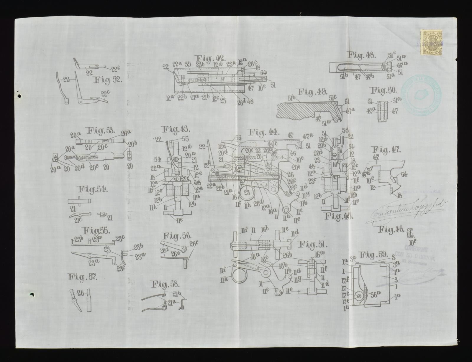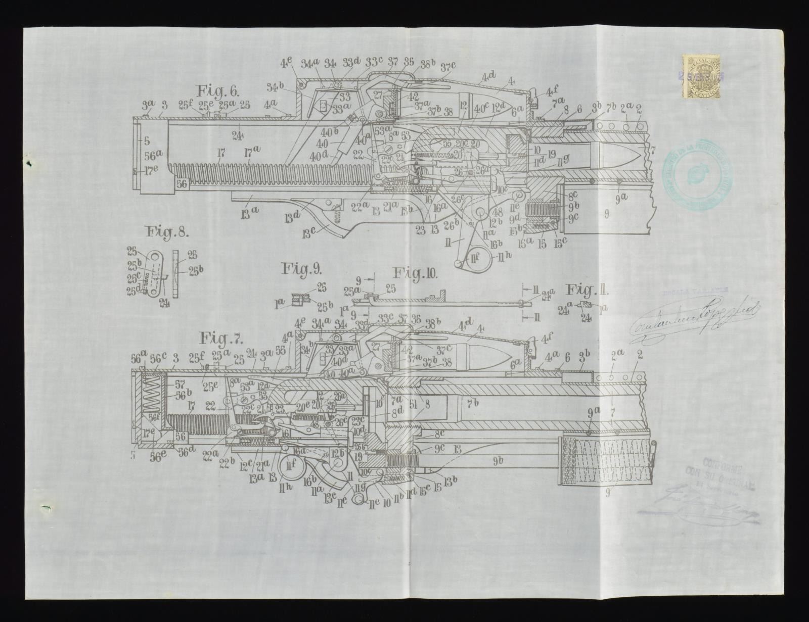 IN MACHINE GUNS & AUTOMATIC CANNONS. John Moses Browning (1855-1926) Legendary inventor of automatic arms, his last automatic rifles are still used today w/ only few modifications since 1921. This patent was approved the year before his death. 78 Typed pages, 15 linen 12" x 16" signed original drawings (4 are disbound). Beautiful set of drawings you will not see again of the Browning Machine gun. CONDITION: very good overall, drawings are fine. (02-16305/JS). $1,000-2,000.