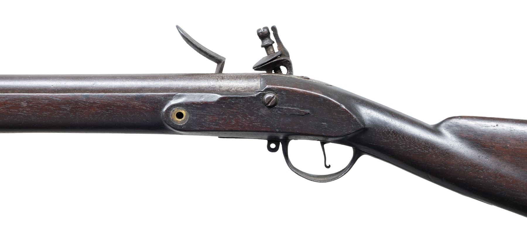 Cal. 75. NSN. French 1763/66 pattern Charleville style musket produced by John Miles of North Liberty, Philadelphia, PA. Muskets of this pattern were produced for the Pennsylvania State Militia circa. late 1790s to the early 1800s. Although this musket is not "CP" (Commonwealth of Pennsylvania) marked, John Miles was 1 of 18 makers of those contract muskets. Bbl. 40 7/8" rnd. with smoothbore. Semi-circular brass blade front sight. Iron lock is marked "MILES" at rear. Plain trigger. Iron trigger guard bow has rectangular box with marking "M31". Pin fastened walnut stock with brass nose cap and long tang brass musket buttplate. Button tipped iron ramrod held by a faceted brass thimble and 2 faceted brass pipes. CONDITION: metal has heavy brown patina appearance with pitting becoming heaviest in breech end of bbl. and as well as the hammer and lockplate. Forward lock screw is missing. Refinished stock is broken through the wrist and sideplate area. Right side of stock forward of lock has a 5 1/2" added wood repair. Functioning lock and trigger. Dark heavily pitted bore. PROVENANCE: Estate Collection of Nicholas Apergis. (01-27459/DS). ANTIQUE. $1,500-2,250.