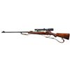 WITH SCOPE. Cal. 7x57. S# 4836 (CA 1922). The 25" tapered round barrel is fitted with a two folding leaf express rear sight in sleeved on island base. Silver bead front is in classic Rigby style ramp. A typical Rigby type sling eye is soldered on. Top of barrel is engraved "Sighted for Rigby Special High Velocity" "John Rigby & Co 43 Sackville St. London W." ".275 Bore Cartridges Pointed Bullet 140 Grains". Left rear is stamped with London nitro proofs for 31 grains of cordite and 173 grain bullet. A Rigby type front scope mount is dovetailed through. Model 98 Mauser large ring standard length action is stamped with S# and top of receiver ring is stippled. Rigby rear scope mount is soldered to bridge. Bolt body is polished and engine turned, handle has been lowered and slimmed. Shroud is fitted with model 70 type safety. Trigger is of standard double pull type. Bottom metal is of standard military type without lock screws, S# is on bow. Round knob pistol grip stock of lightly streaked European walnut measures 13 1/2" over checkered wood butt. Point pattern checkering is at grip and around forend. A sling loop and silver oval engraved "NEJ" are on toeline. Rifle is fitted with Zeiss Diavari-C 1.5-4.5X scope with three post reticle in custom rings. CONDITION: fine as refinished, metal parts retaining about 90% good quality reblue. Stock has a good scattering of marks and scratches in its renewed oil finish. Checkering re cut. Bore is shiny with strong rifling and some erosion at throat. Mechanically good, scope is good with a few marks on exterior, optically clear but with a flake at lower left of field. Bolt must be removed to install scope. Rifle is fitted with a brown leather sling by J.C. Ennis. (22-5858/MGM). CURIO. $5,500-7,500.