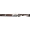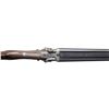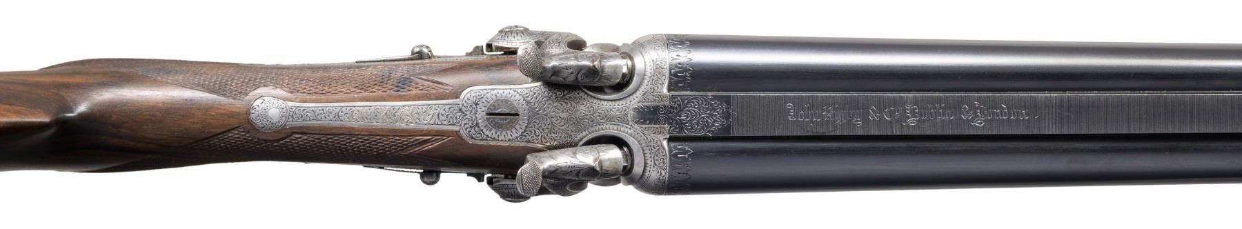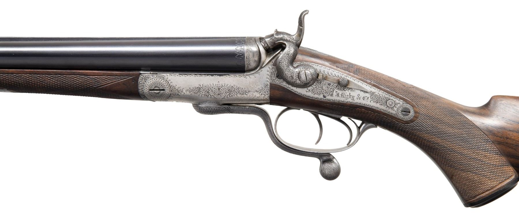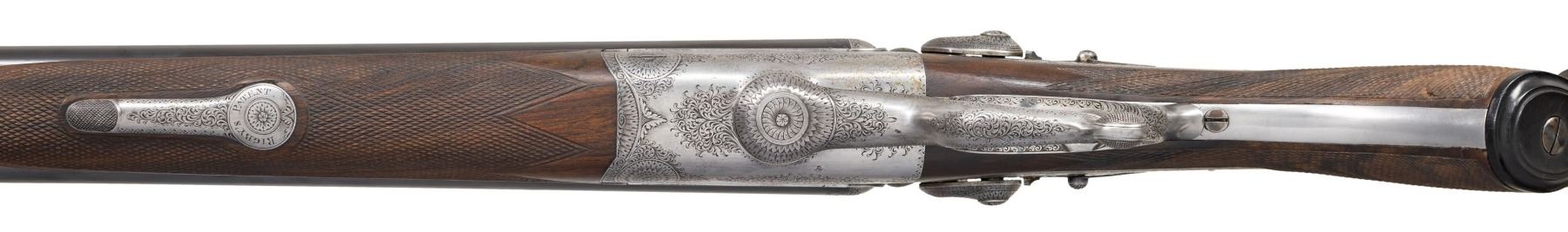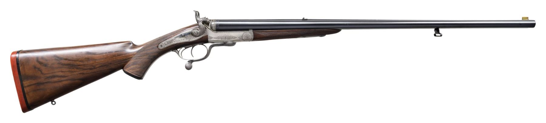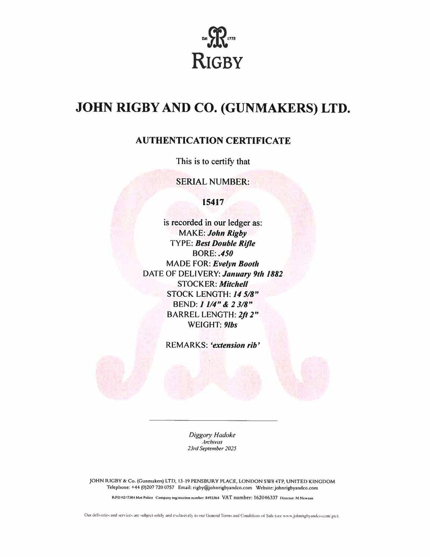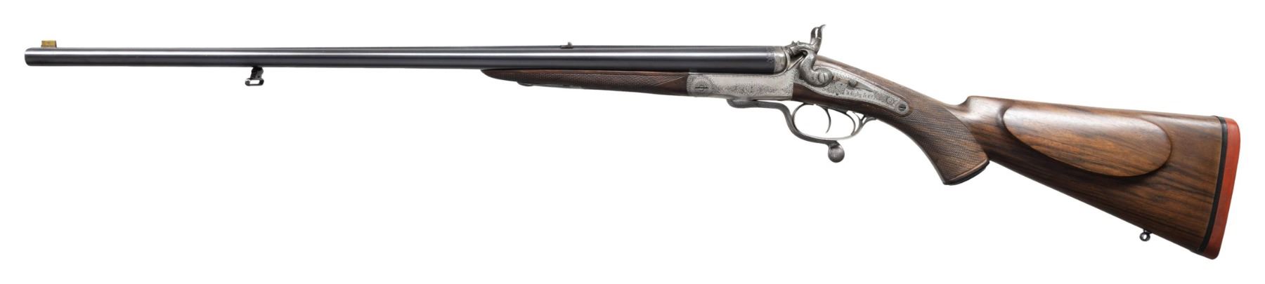 DOCUMENTED TO EVELYN BOOTH: THE MAN WHO HELPED SAVE BUFFALO BILL'S WILD WEST SHOW. Cal. 450 BPE. S# 15417. Bbls. 26". In December 1884, the Wild West Show ferried it's way down the Mississippi River en route to a scheduled Exhibition in the City of New Orleans. Buffalo Bill Cody was already in New Orleans when he received a telegram that the ship and everything on it had sunk to the bottom of the river. The estimated losses were estimated at $20,000. While Cody would replace his losses in time for the Exhibition, the show was a complete disaster. Daily rain and stormy weather kept the audience' attendance at a minimum for the entire 3 months the Exhibition was there. Booth's January 1, '85 entry reads "Went up with Pemberton to see Buffalo Bill's show again, I fear the "Hon. Cody" is having a bad time of it as there are hardly any spectators and his expenses must be very heavy". By the time it was all over, Cody was shouldered with an additional $60,000 in debt. Evelyn Thomas Barton Booth (1860-1901), a young Englishman of considerable wealth, arrived in America in November 1884 in search of every bit of adventure the young country had to offer. Booth's personal travel journal, which was discovered at the Denver Public Library, confirms that Booth found what he was looking for. The fully transcribed journal "BUFFALO BILL, BOOZERS, BROTHELS and BARE KNUCKLE BRAWLERS" by Kellen Cutsforth is included with the rifle. Mentions of Bill Cody, their hunts and adventures together continue throughout the journal and finally in March 1885, the two enter into a shooting match. Booth's journal reads "The next day the match came off. It was terribly windy which prevented accurate shooting. I won [by] three birds killing 40 to 37. Bill immediately challenged me again to shoot on the following Wednesday, the day appointed for his benefit and another match was arranged.". Booth had bested the Legendary Buffalo Bill. Undoubtedly, word of his loss to an unknown reaching the general masses would not sit well with the renowned showman and on April 1st there was a rematch, this time with spectators. Booth's journal reads as follows "The next day was Buffalo Bill's benefit and there were about 3,000 people there. The return match was shot off with the following result, Bill 47 Self 46, though three were counted to him which he never touched".Booth notes on page 89 of Cutsforth's transcription "He is very anxious to take the whole show over to England next spring and I have had several talks with him about it and am going to make an inquiry on the other side." Upon returning to America in 1886, Booth and Cody entered into a 3 year partnership with Booth paying Cody $30,000 in exchange for 25% of all profits from the show. Buffalo Bill's Wild West show achieved remarkable success during its London engagements, beginning with its debut at the 1887 American Exhibition held in conjunction with Queen Victoria's Golden Jubilee. Queen Victoria herself attended a command performance and thoroughly enjoyed it, giving the show immense prestige and driving even greater public interest. The London exhibition became one of the most profitable and influential tours in the show's history. It cemented Buffalo Bill's international fame, introduced many Europeans to romanticized images of the American West, and established the Wild West show as a global cultural phenomenon that remains well known, even today. If not for a wealthy young Englishman by the name Evelyn Booth, it may have never come to pass.This "best" quality rifle was delivered in January of 1882 (factory letter) in time for Booth's much anticipated American hunting trip. It has 26" dovetailed steel barrels fitted with slightly raised file cut rib with extension. Rifle is sighted with one standing one folding express rear and tall blade brass front sights. Rear portion of rib with scroll engraving is inscribed in Gothic script "John Rigby & Co Dublin & London". Barrel flats are stamped with London black powder proofs, S# and Rigby "RR" trademark. Bottoms of barrels are stamped "TB" (Thomas Bissell). Round bodied Jones under lever action fitted with penninsula back spring non-rebounding locks having stout serpintine hammers and back sliding safetys, has breech face monogram "TB" (Thomas Bissell made a good many of Rigby's rifles and guns, his S# "1185" is stamped above monogram). Action and lockplates are engraved with about 80% coverage very nicely cut shaded scroll within scroll borders. "J. Rigby & Co" is on each lockplate. Fine quality replacement capped pistol grip buttstock made of nicely marbled European walnut measures 14-1/2" over red "Old English" pad. Stock features hard rubber grip cap, right hand cheekpiece, well cut grip checkering and sling eye. Matching splinter forend is near fully checkered and is fitted with forward pivoting lever release engraved "Rigby's Patent". UNATTACHED ACCESSORIES: factory letter, book "BUFFALO BILL BOOZERS, BROTHELS AND BARE-KNUCKLE BRAWLERS, 3 old firing pins, 1 turned aluminum what's-it, 9 brass cases. CONDITION: fine as refurbished. Barrels retaining nearly all of a "best" re-black. Action and locks cleaned to coin finish. Engraving remains clear. Tang of trigger plate correctly replaced and has not been engraved. Newly made buttstock of correct style retains nearly all of its original finish. Checkering with little wear. Forend with original wood has been lightly refinished and checkering re-cut; matches buttstock well. Bores are very good to fine; mostly shiny. Rifling strong; shows some wear at breech ends. Tubes show scattered pitting throughout. Action is tight. Barrels on face. Locks fine. Safetys work. (01-28036/BH/MGM). ANTIQUE. $20,000-40,000.