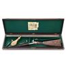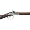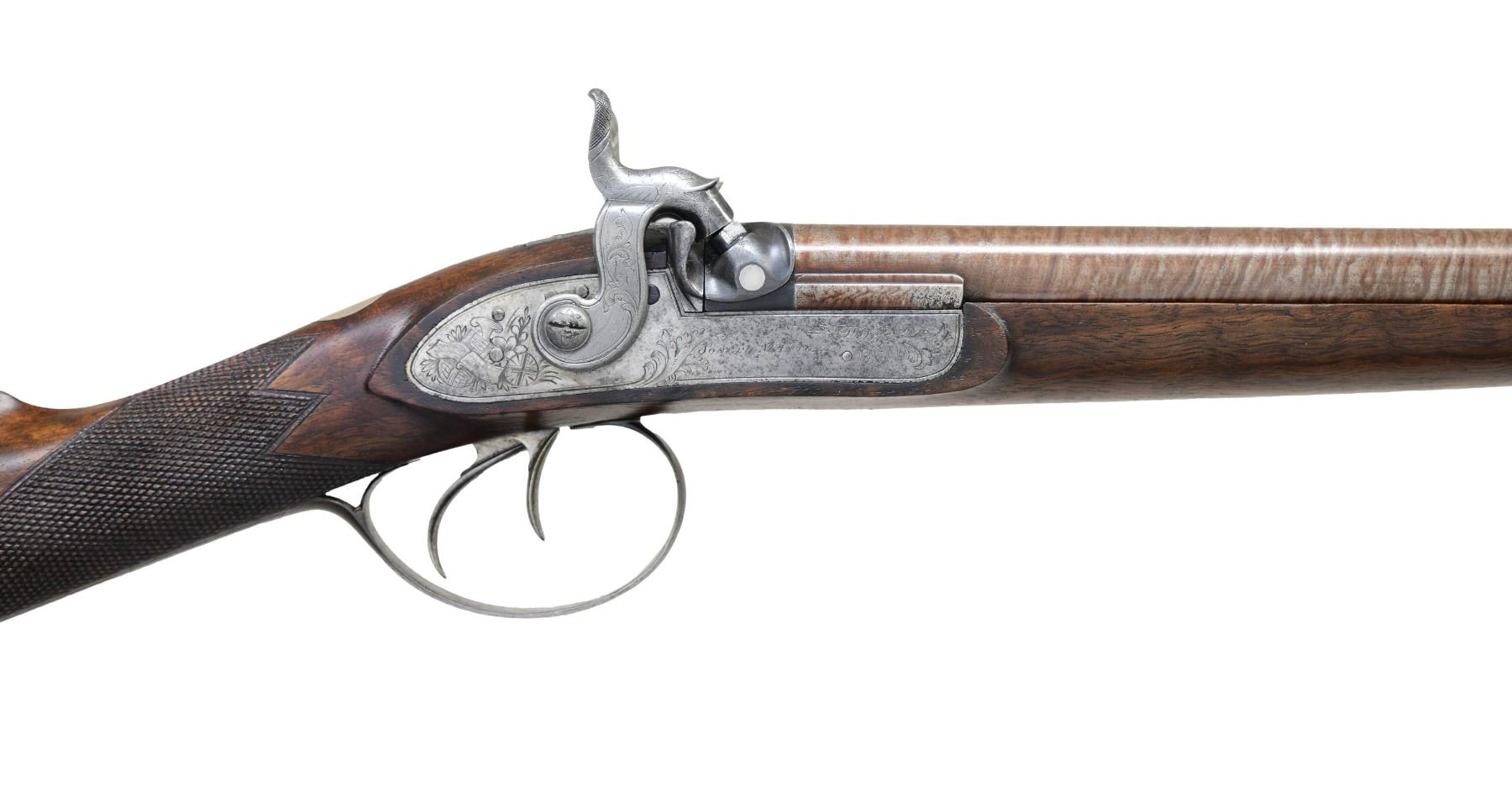 TO PERCUSSION WITH CASE. Cal. 22 Bore. S# 1442 (1800). The 32" skelp twist barrels are engraved "Joseph Manton Davies Street Berkeley Square London" on deeply set narrow rib. Breech plugs have unvented platinum blowouts. Bottoms of barrels are stamped with S# and London black powder proofs. Breech plugs are unmarked. Breech iron with integrel fences is scroll engraved. Front spring locks with serpentine flat faced hammers are engraved with musical stand of arms and scroll. "Joseph Manton" is on each lockplate. Quilt figured European walnut straight grip stock measures 14-3/8" over iron buttplate with short top tang. Trigger plate has pineapple finial. Trigger guard is engraved with musical arms on bow. Stock features point pattern checkering at grip and a vacant silver oval at top of grip. Stock attaches to barrels with captive side bolt through oval silver escutcheons. An ebony ramrod with brass tip and tail (worm under cap) is held by two plain pipes and pineapple thimble. MEASUREMENTS: BBLS: Bore Diameter: L .595. R .595. Wall thickness: L .040. R .046. STOCK: DAH: 1-15/16". DAC: 1-7/16". CAST: neutral. LOP: 14-3/8". WEIGHT: 6 lb. 0 oz. UNATTACHED ACCESSORIES: gun is housed in a vintage mahogany case with inlet brass corners and circular "D" ring handle which has dual pivoting hook closure. Interior is lined in green cloth and has old Manton label in lid. Case contains a brass bodied wild horse embossed powder flask by Hawksley, powder & shot dippers and cleaning equipment. CONDITION: good as restored. Barrels retaining over 90% of a dramatic re-brown showing excellent pattern. Other metal parts are cleaned to silver gray patina. Stock retains most of an old oil refinish. Checkering re-cut. Bores are shiny over light frosting. Locks are good. Case is good. Exterior refinished with some cracks. Interior cloth replaced. Old label is foxed and shows some tatters. Accessories are good. PROVENANCE: consignor's notes. From The Malcolm King Collection. (01-25792/MGM). ANTIQUE. $3,000-5,000.