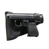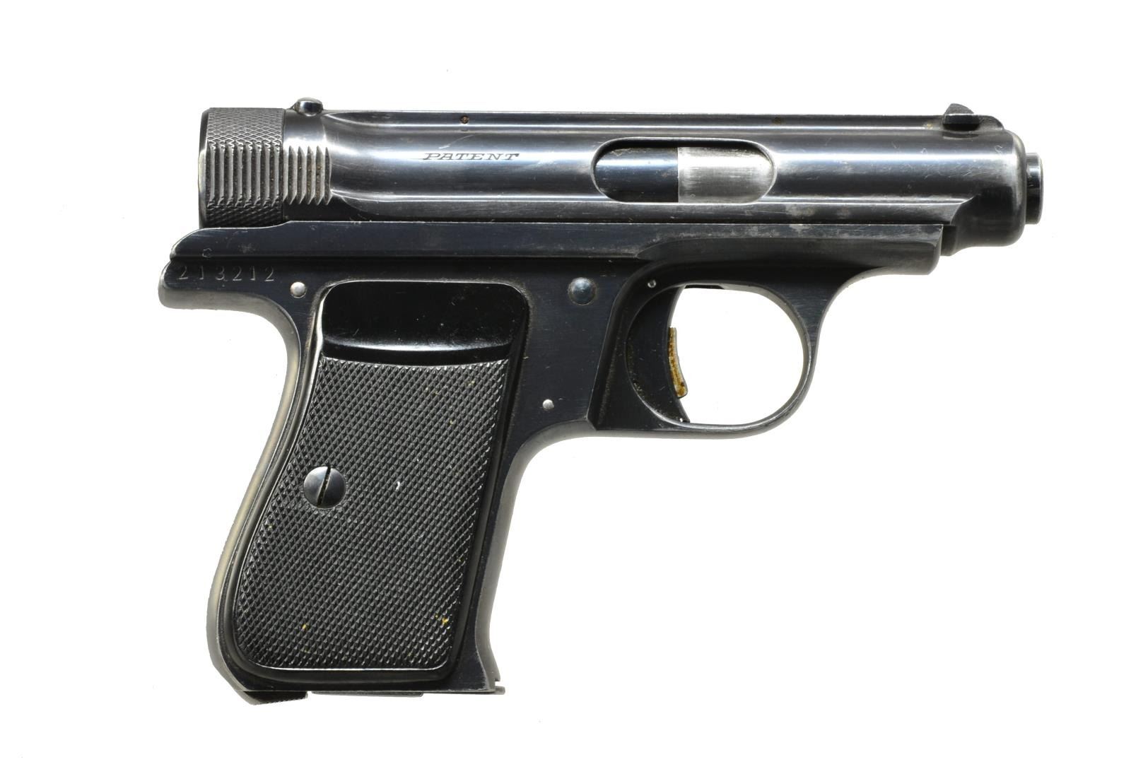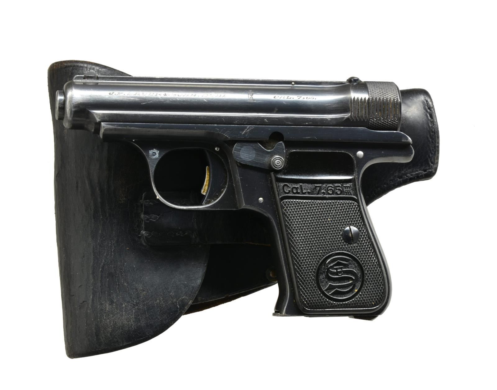 Cal. 7.65mm (32 ACP). S# 213212. Bbl. 3". Mfg. 1930s-1937 w/single safety lever on left side that also locks slide (no push button safety) plus trigger safety of style popularized by Glock. Checkered S&S logo & "Cal. 7,65m/m" marked hard rubber grips retained by nitre blued screws. Crown N proof on back of slide retainer (latched by spring loaded rear sight) plus right side of frame near trigger pivot. Front underside of slide numbered "212". Slide markings in German variation. Left front of trigger guard w/ sunburst symbol having "K" in middle indicating police acceptance. Windage adj. dovetailed front sight. MAGS: 2 good 8 rd. w/ worn spines good plus unmarked & almost good w/ S&S floorplate plus light dent on right of body near bottom; parallel to base. UNATTACHED ACCESSORIES: good to very good flap holster w/ stud & strap retention. Mag. pouch on front & single wide angled belt loop; no manufacture or user markings. CONDITION: very good general appearance w/ high point wear most noticeable near muzzle plus some light scratches on left side above safety area. (20-3254/NW). CURIO. $800-1,200.