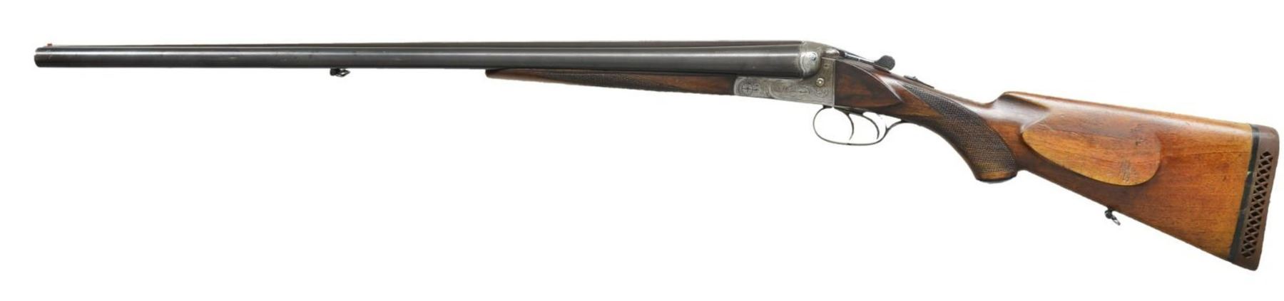 Cal. 12 Ga. S# 2290. Bbls. 28 5/16" solid matted rib w/ 2 3/4" chambers & choked “FULL” & “FULL”. Matching S#s, Dbl. triggers & extractors. Lightly engraved w/ geometric designs, checkered splinter forend & pistol grip buttstock, w/ raised cheek rest, ebony capped grip & sling swivels. LOP to added recoil pad is 14” & 14 7/8”. Import marked. CONDITION: blued bbls. retain about 80% coverage w/ light rust. Frame is a gunmetal gray patina. Stock set shows numerous light to moderate scratches & dings. Bores are fairly bright w/ heavy streaky residue & scratches. PROVENANCE: "Save the Fine Guns". T&G German Gun Imports, bringing fine German guns to a more appreciative market. (22-5057/CW). CURIO. $300-500.