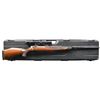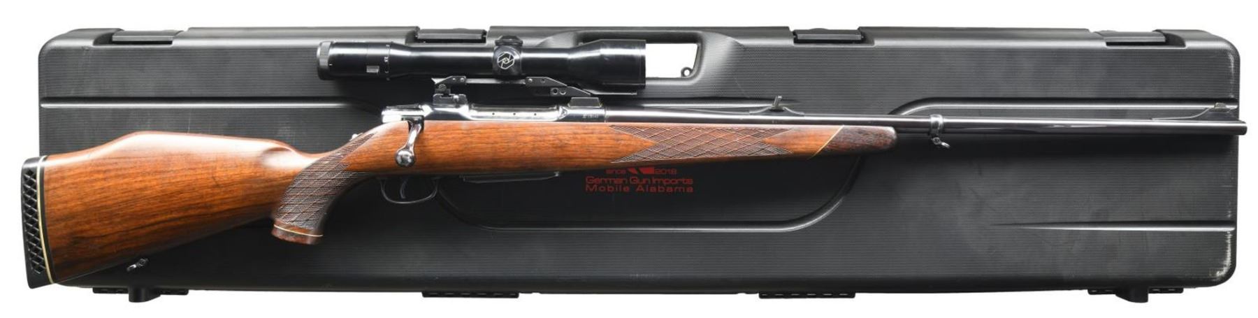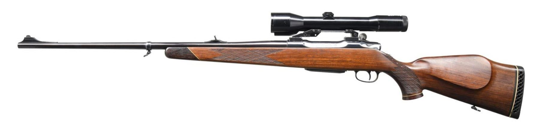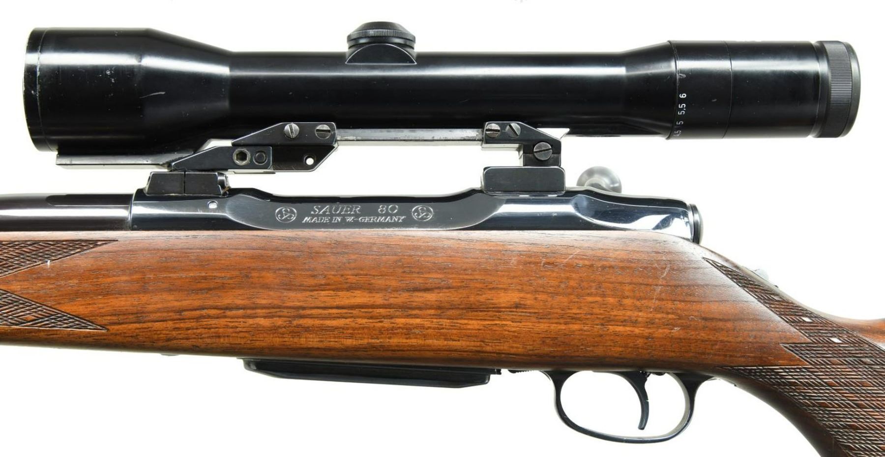 VARIABLE SCOPE. Cal. 9.3x64 Brennecke. S# E13140. Bbl. 25 1/2", fitted with single standing leaf rear sight in island base & sourdough front in high ramp. Caliber & Sauer markings are on top of bbl. Action fitted with ERA type Q-D swing off bases & has factory markings on left side. Action features single set trigger, tang safety and detachable 3 rd. mag. Pistol grip stock of lightly streaked European walnut measures 14 1/2" over open sided “Whiteline” black pad. Stock features Monte Carlo comb, swept right hand cheekpiece, rosewood grip cap & forend tip with white wood spacers & sling loops. Point pattern skipline checkering is on grip and each side of forend. Zeiss Diavari-Z 1.5-6x 30mm rail scope with 3 post reticle is in ERA Q-D mounts. MAGS: 1-3 rd. UNATTACHED ACCESSORIES: black plastic case. CONDITION: Metal retaining over 90% reblue with pitting around rear sight & some high edge wear, mostly noted on trigger guard and mag. Stock retains most of its original oil finish with a fair scattering of marks & scratches. Bore is bright and shiny. Mechanically smooth. Scope is fine with some silvering and marks on objective bell. Optically clear. The 9.3x64 Brennecke is ballistically the equivalent of the .375 H&H Magnum. PROVENANCE: "Save the Fine Guns". T&G German Gun Imports, bringing fine German guns to a more appreciative market. (23-2086/MD). MODERN. $900-1,200.