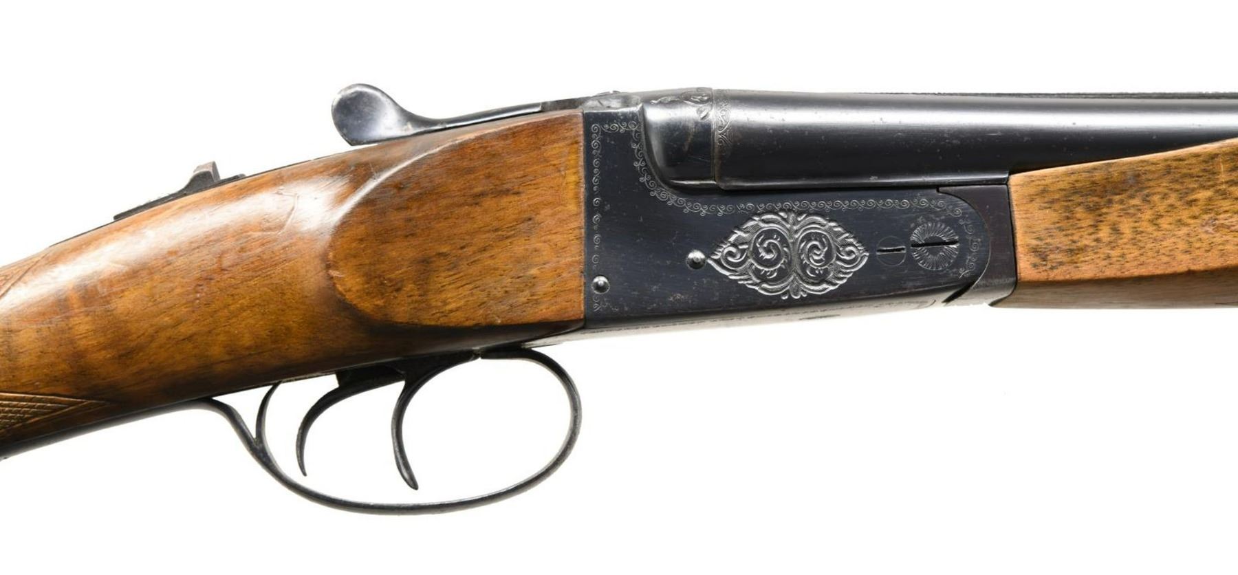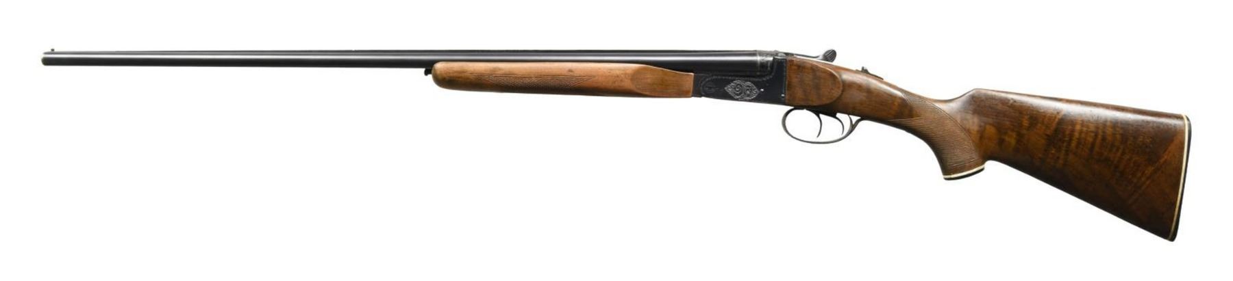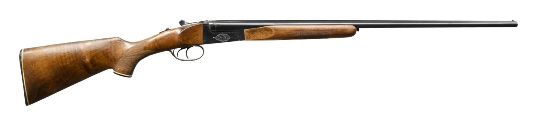 Cal. 410 ga. 3". S# 158327. Bbl. 26" w/ brass front bead. Fixed full & full chokes. Blue boxlock action w/ highlights of scroll ornamentation. Double triggers, extractors. Beavertail forearm & plastic capped pistol grip stock have cut checkering. LOP: 14 1/4" over original buttplate & white line spacer. Mfg. in Spain. CONDITION: bbl. & action retain over 80% blue showing edge & carry wear w/ scattered spots of corrosion. Wood has added finish over wear w/ scattered handling marks. Good bright bores. (23-4840/DS). CURIO. $500-800.