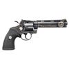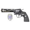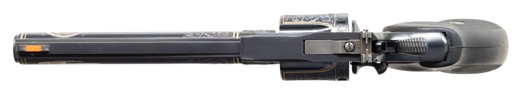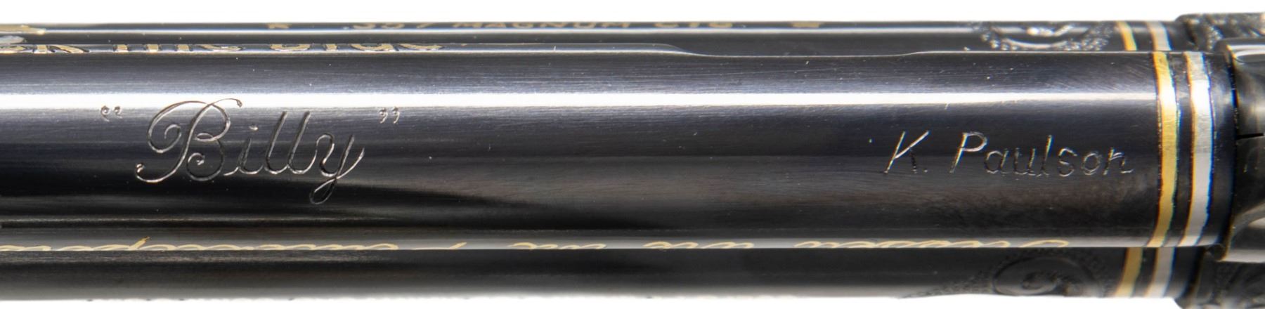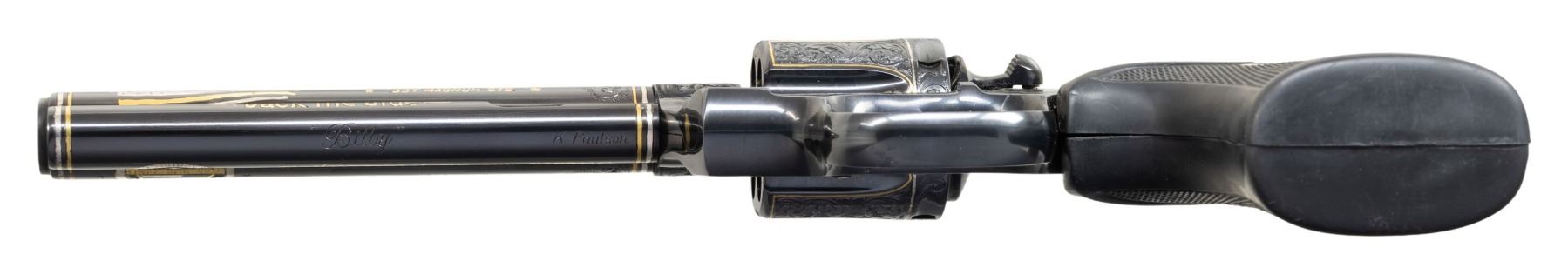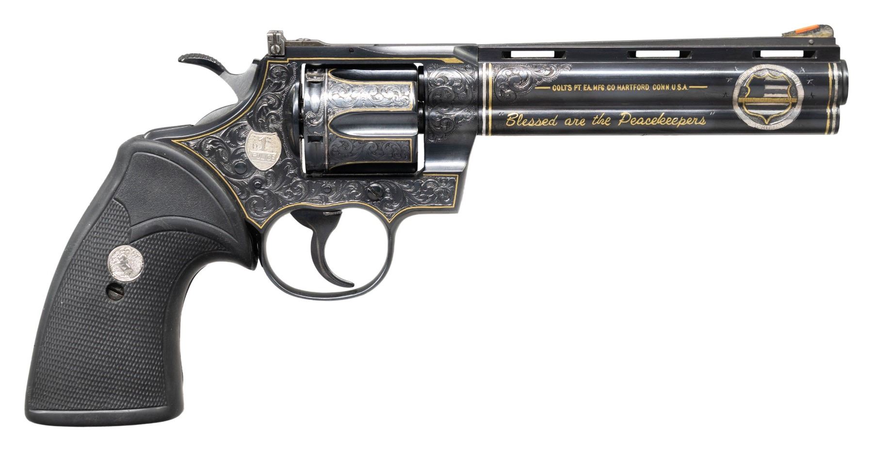 REVOLVER WITH GOLD & SILVER INLAYS. Cal. 357 Mag. S# PN13836. Bbl. 6" with vent rib, red ramp front sight & fully adjustable rear. Mfg. 1996 and subsequently engraved by Wisconsin native & Kolar engraver, Kenn Paulson. Inspiration for this revolver being "Back the Blue" & "Thin Blue Line" movements in support of the Nation's Law Enforcement officers who put their lives on the line each and every day. On September 7, 1994 Milwaukee Police Officer William A. Robertson was killed in the line of duty in a random & unprovoked attack. Bottom of bbl. inscribe "Billy". Frame, cyl & breech end of bbl. have foliate scroll engraving of punch dot background. Frame contours & cyl. flute outlines have gold wire inlay. Breech and muzzle end of bbl. have double bands of gold and silver wire inlay. Right side of frame has silver police shield inlay engraved "1 / POLICE". Left side of frame Rampant Colt in silver wire bordered shield. All factory bbl. markings highlighted in gold. Left side of bbl. assembly inlaid with silver tattered U.S. flag; one stripe gold over gold inlaid "Back the Blue". Right side bbl. assembly bears gold inlaid "Blesses are the Peacekeepers along with silver / blue/ gold inlaid "THIN BLUE LINE" Police shield having silver circular border inscribed "REMEMBER THE FALLEN / SACRIFICE". Bottom of bbl. has engraver's signature "K. Paulson". Revolver stocked with 1 piece checkered Pachmayr rubber grip with nickel Rampant Colt medallions. UNATTACHED ACCESSORIES: double glass sided display case containing tribute badge marked "WM ROBERTSON" / "MILWAUKEE"/ State of Wisconsin emblem / "BACK THE BLUE" / "785". Original blue plastic factory case containing paperwork. CONDITION: all aspects near excellent, appears unused since time of upgrade. PROVENANCE: From the Buckstix Collection. (25-6318/BH). MODERN. $7,500-12,500.