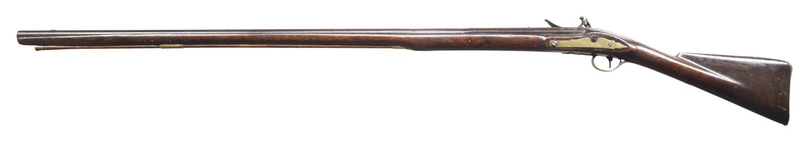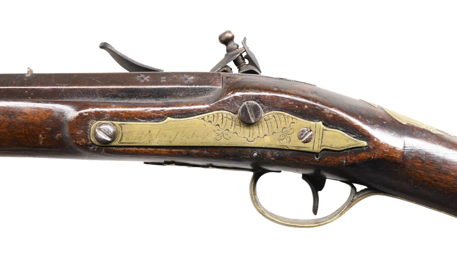 Cal. 66. NSN. Bbl. 40 1/8". Flintlock fowler or trade musket, likely produced in England. The lockplate is marked "KETLAND / & Co" under the pan. The round barrel features a faceted breech that is marked "LONDON" on the top flat, with "TK" between two British crowned crossed swords on the left quarter flat. The full-length wood stock features a brass buttplate, sideplate, trigger guard, escutcheon plate, entry thimble, and ramrod thimble. Buttplate, sideplate, trigger guard, and escutcheon plate exhibit light foliate & linear engraving. German silver blade front sight with brass square notch rear sight. Improper brass-tipped wooden ramrod displays well. CONDITION: all iron has a dark overall patina. Brass has a pleasing mustard patina. Stock has a small crack between the trigger guard and the rear of the lock. Lock may not be original to this gun but is the correct period and fits reasonably well. Fair bore. (01-25179/BF). $600-900.